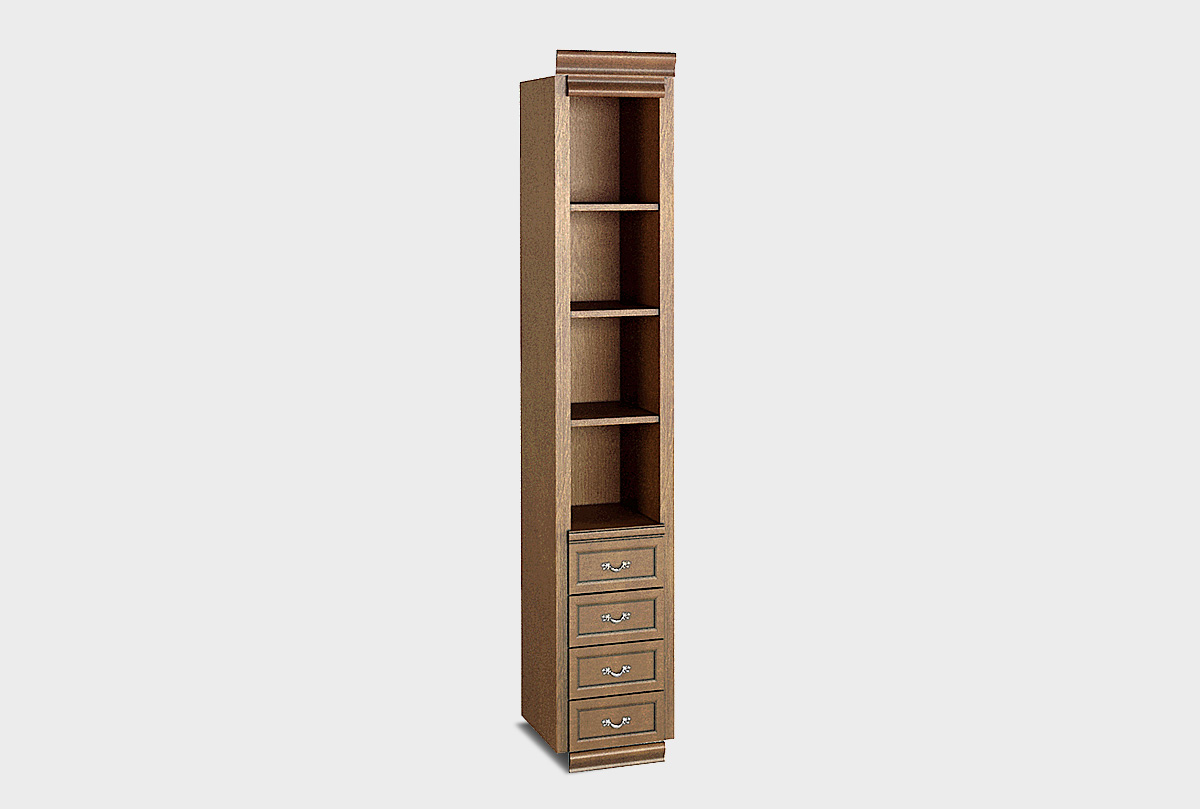 Стеллаж с ящиками «Тэфи» в цвете «классик» из массива и шпона дуба станет прекрасным дополнением как к кабинету в классическом стиле, так и к гостиной или спальне.