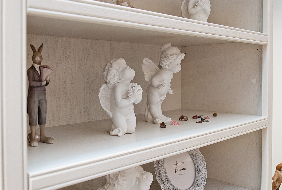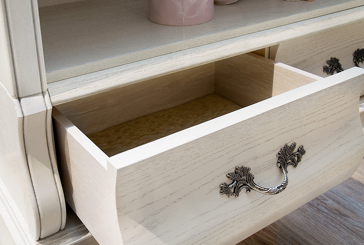Стеллаж «Тэфи» в цвете «белая эмаль с темной патиной» станет прекрасным дополнением как к кабинету в классическом стиле, так и к гостиной или спальне. На открытых полках Вы сможете расставить книги или декоративные элементы, а важные документы спрятать в выдвижных ящиках.