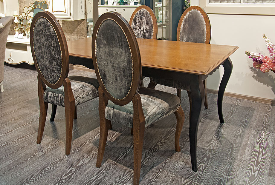 Обеденный стол входит в коллекцию классических роскошных предметов мебели «Тэфи». Классицизм тяготеет к спокойным благородным тонам, поэтому Вашим выбором может стать стол цвета «орех» или «белая эмаль с темной патиной». Благодаря изумительно красивой столешнице и изогнутым ножкам, такой обеденный стол достойно украсит столовую или гостиную и станет уютным местом для теплых душевных встреч в Вашем доме.