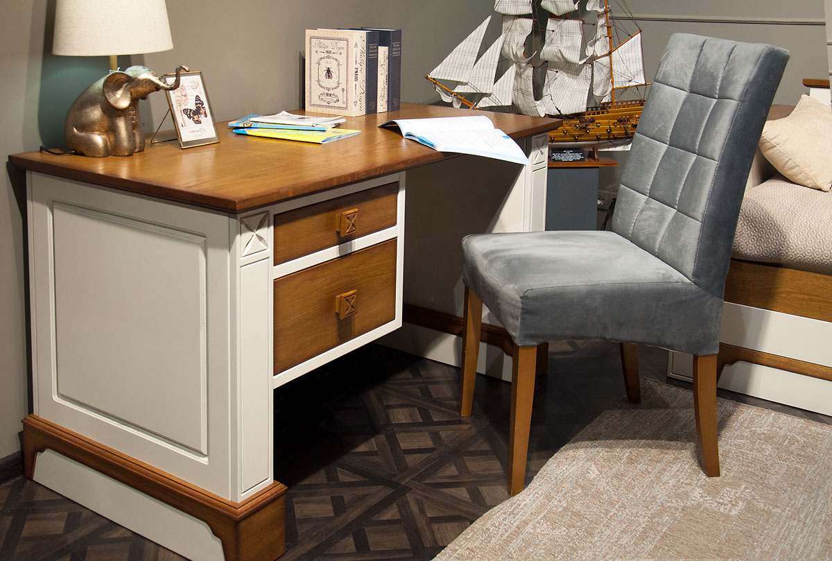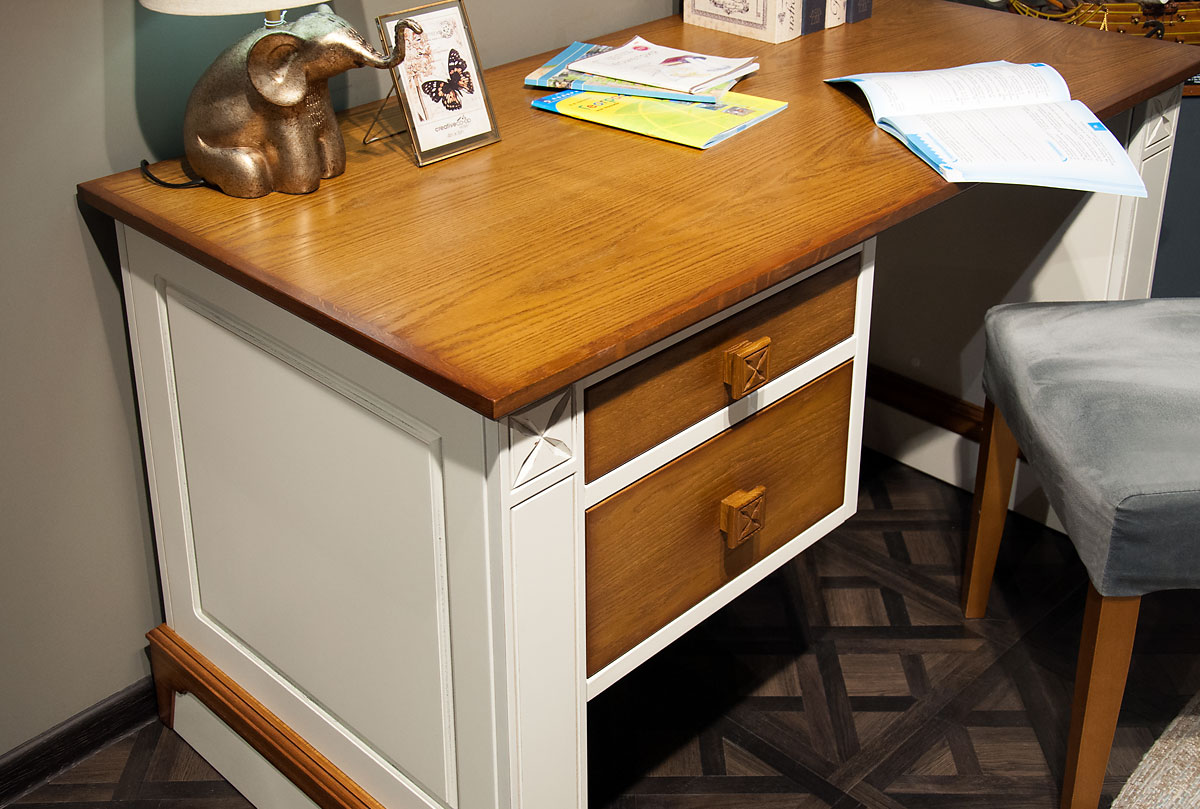 Письменный стол «Бриансон» с одной тумбой слева – добротный и стильный, сочетает в себе оригинальный дизайн и практичность выполнен из массива и шпона дуба, тонированный в оттенок: «жемчуг+дуб». Стол «Бриансон» оснащен двумя выдвижными вместительными ящиками с направляющими полного выдвижения.