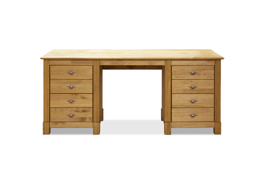 Двухтумбовый письменный стол «Рауна» выполнен из сертифицированного массива сосны (FSC®). Привлекательный дизайн подчеркивает видимая структура дерева. В результате офисная мебель гармонично вписывается практически в любой дизайн интерьера. Просторная рабочая поверхность позволяет разложить все необходимые офисные принадлежности, кроме того достаточно места и для компьютера с аксессуарами. Таким образом, письменный стол отлично впишется как в кабинет, так и для детской и подростковой комнаты. Благодаря обширному пространству для хранения в ящиках, уместятся все документы, заметки и письменные принадлежности. Ящики расположены на металлических направляющих. Ручки имеют привлекательный винтажный оттенок.