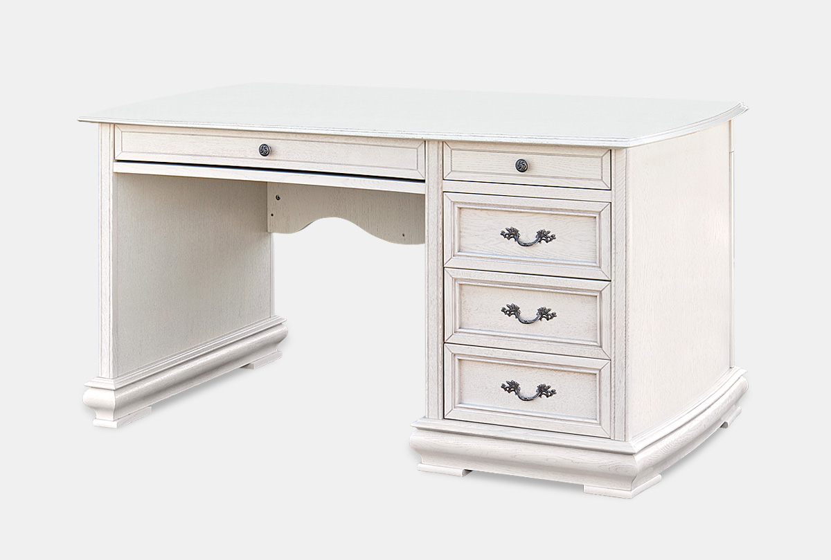 Письменный стол «Тэфи» (Tefi) с одной тумбой исполнен в классическом стиле и прекрасно впишется в интерьер домашнего кабинета. Благодаря массиву дуба стол выглядит основательно и настраивает на полную сосредоточенность, а работа за ним приносит истинное удовольствие. Цветовая палитра представлена деликатными оттенками: «классик» - натурально, «белая эмаль с темной патиной» - по-настоящему аристократично, «амбэр с белой патиной» - оригинально. Выдвижные ящички радуют мягкой велюровой отделкой, а доставать предметы из них удобно как правшам, так и левшам, поскольку стол выполнен в двух конфигурациях: с тумбой справа и с тумбой слева.
