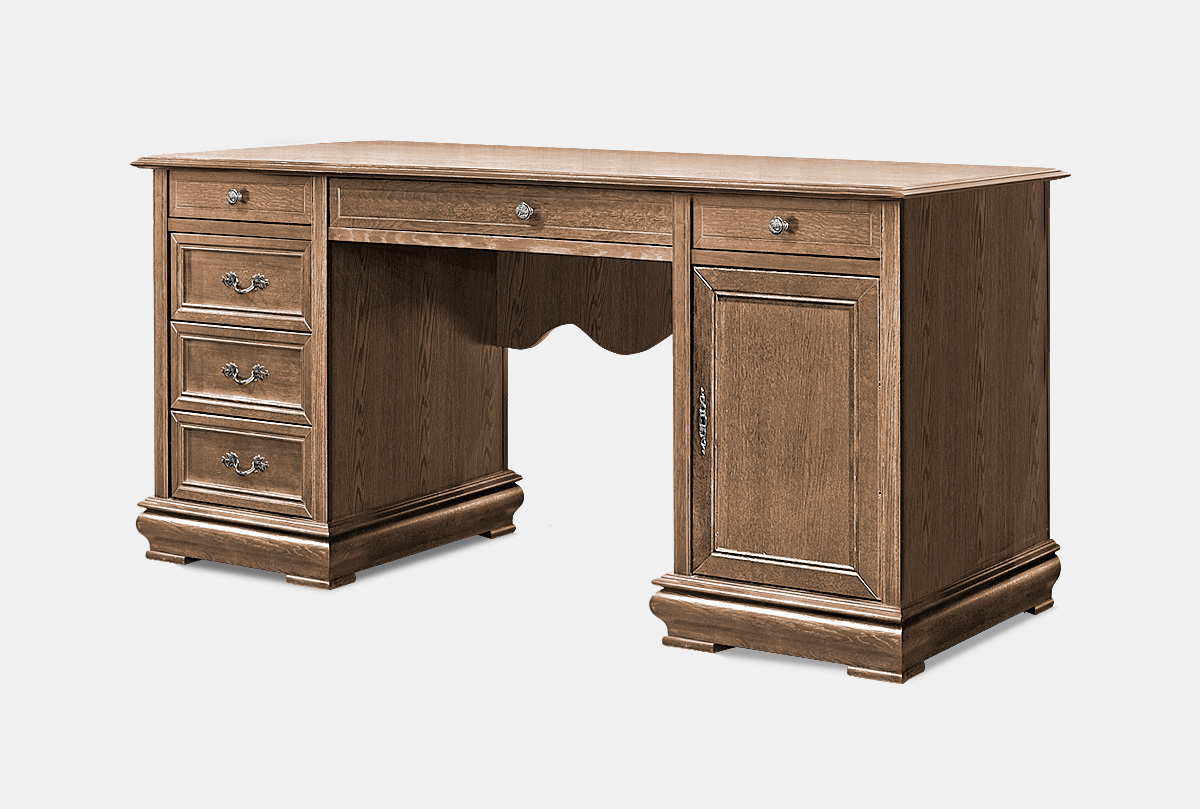 Настоящей изюминкой домашнего кабинета может стать письменный стол в цвете «классик» из коллекции «Тэфи» с двумя тумбами. Натуральная фактура дуба, тонкие оттенки цветовой гаммы придают столу поистине аристократичный вид. На представительной дубовой столешнице гармонично смотрятся и современные гаджеты и раритетные письменные принадлежности. Дно ящиков обращает на себя внимание великолепной велюровой отделкой.