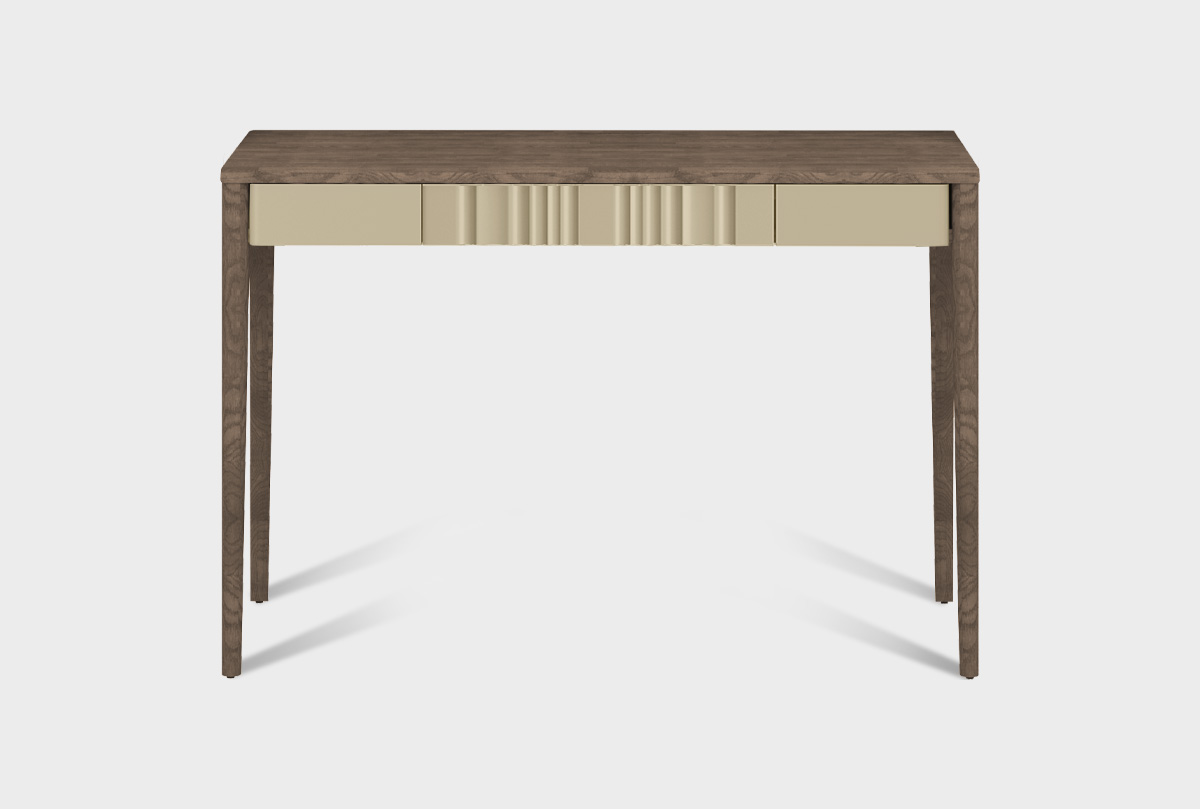 Этот стол придаст любой спальне изысканность и лёгкость. Высокие ножки зрительно облегчают пространство, а волнообразный фасад задаёт декоративный ритм. Особенно красиво сочетается с мягким текстилем и светлым фоном.