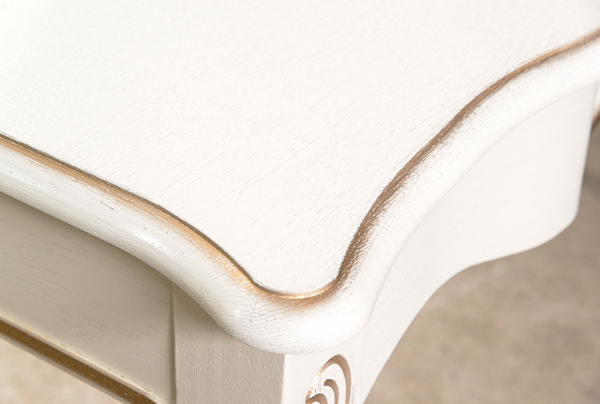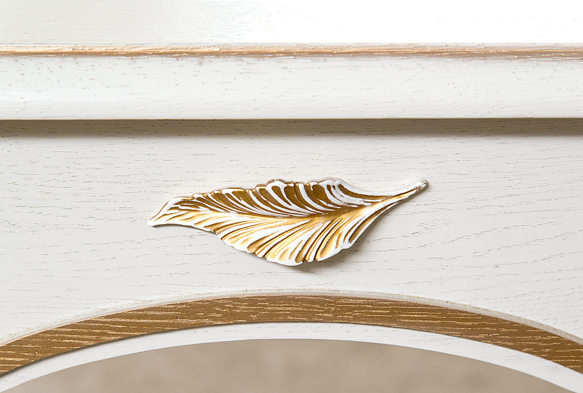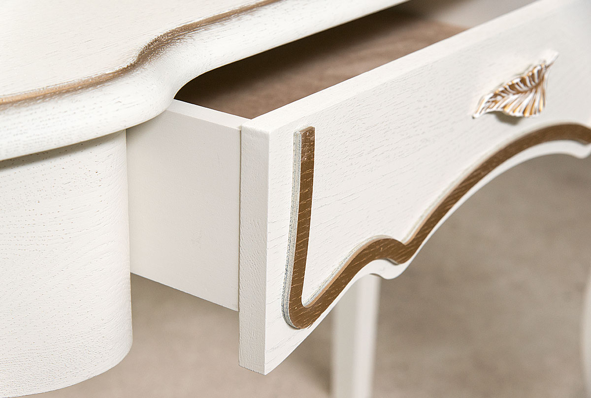 Туалетный стол из коллекции «Трио» в цвете «белая эмаль с золотой патиной» - это настоящее сокровище. Изготовленный из массива и шпона дуба, он имеет оригинальный дизайн: изящные гнутые ножки, выдвижной ящик, в котором можно хранить косметику, и дно которого выстлано велюром – все это будто создано для королевских особ. Высококачественная итальянская фурнитура в виде лепестка придает изделию еще большую утонченность. А что касается функциональной стороны – его можно использовать не только по назначению, но еще и как письменный стол или стол для компьютера.