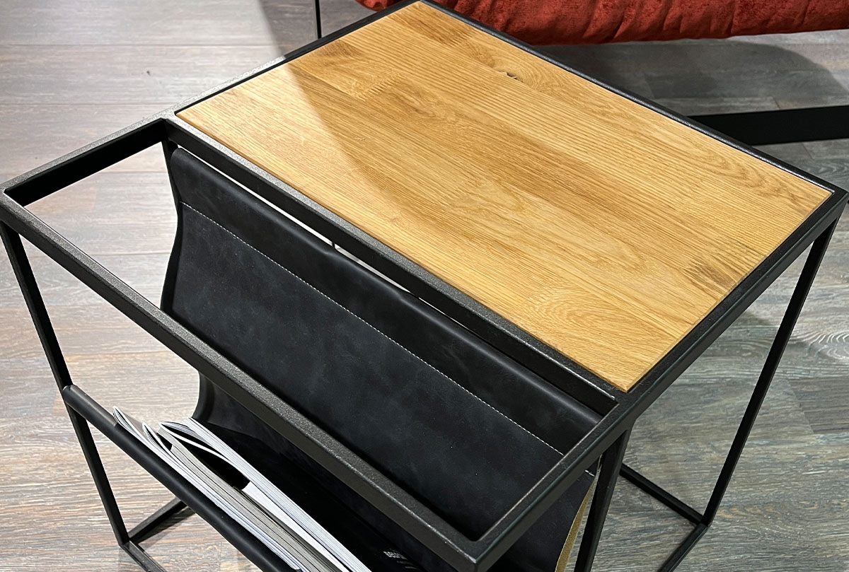 Стол журнальный c газетницей «Арт» в цвете «бейц-масло, чёрный металл» выполнен в современном стиле Лофт с сочетанием текстуры натурального дерева и металла..