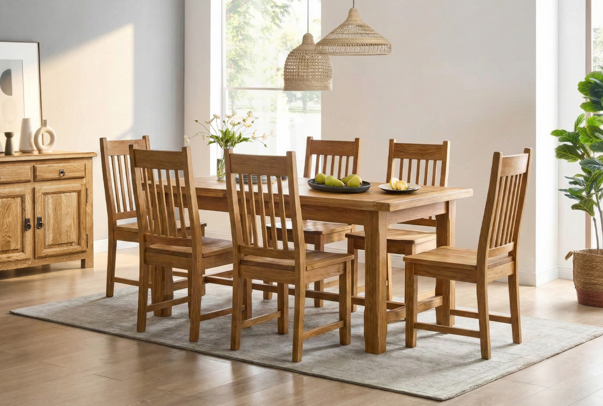 Все материалы и покрытия экологически безопасны. Лак с патиной не только защищает поверхность, но и подчёркивает естественную красоту дуба, придавая мебели характер и глубину цвета.