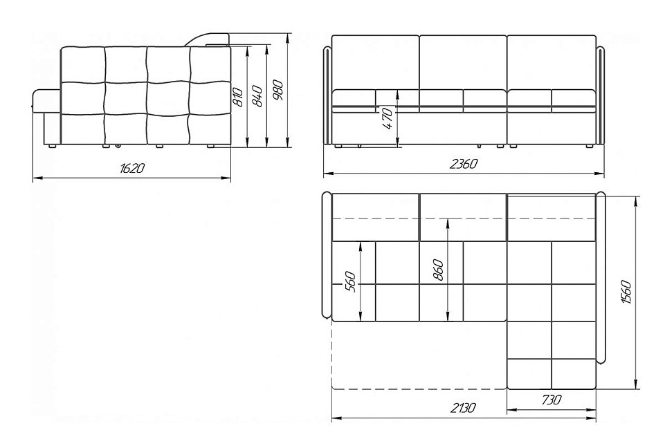 ✅ Высота посадочного места - 450 мм, глубина посадочного места - 560 мм, ширина посадочного места дивана - 2130 мм, ширина посадочного места оттоманки - 730 мм.