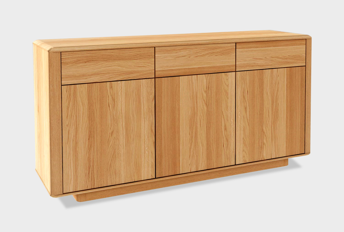 Тумба «Тор» с ящиками — воплощение сбалансированной формы и утончённого стиля. Широкий фасад с плавными линиями и естественной текстурой дуба делает изделие выразительным акцентом в интерьере. Три распашные двери и аккуратные выдвижные ящики обеспечивают продуманное хранение — от посуды и текстиля до документов и аксессуаров. Лаконичные прорези вместо ручек подчеркивают минимализм и эстетику коллекции.