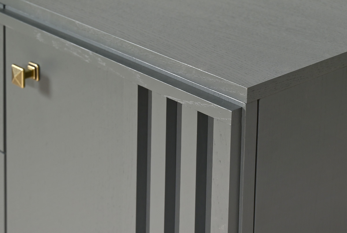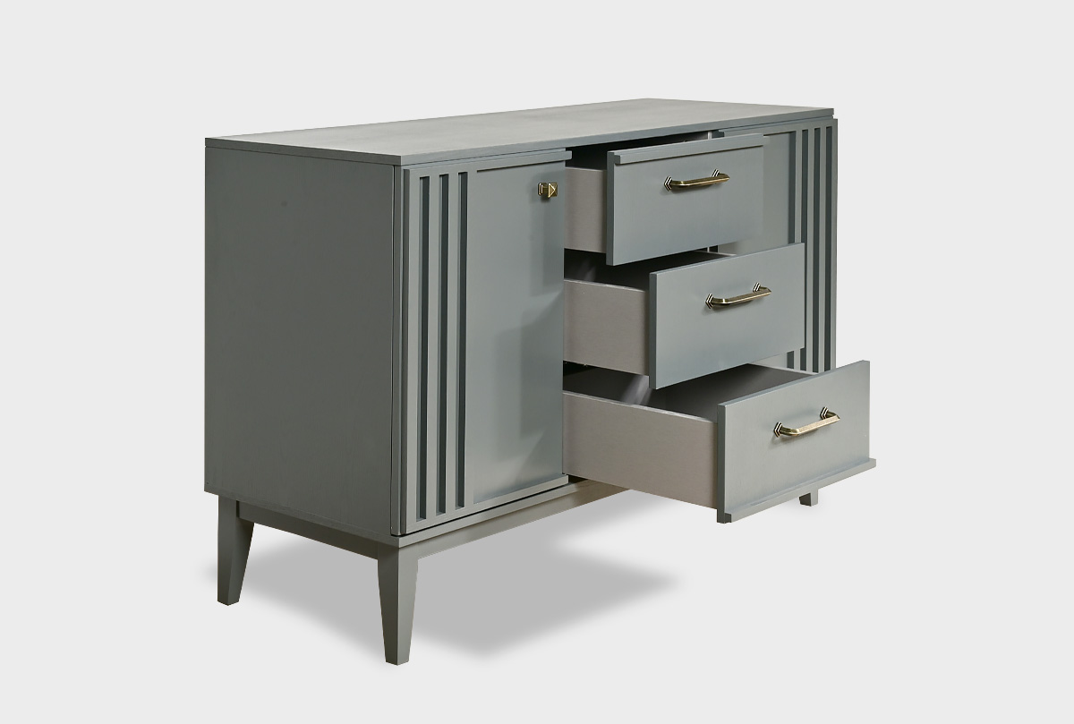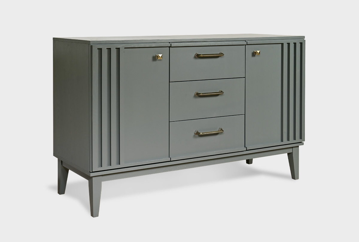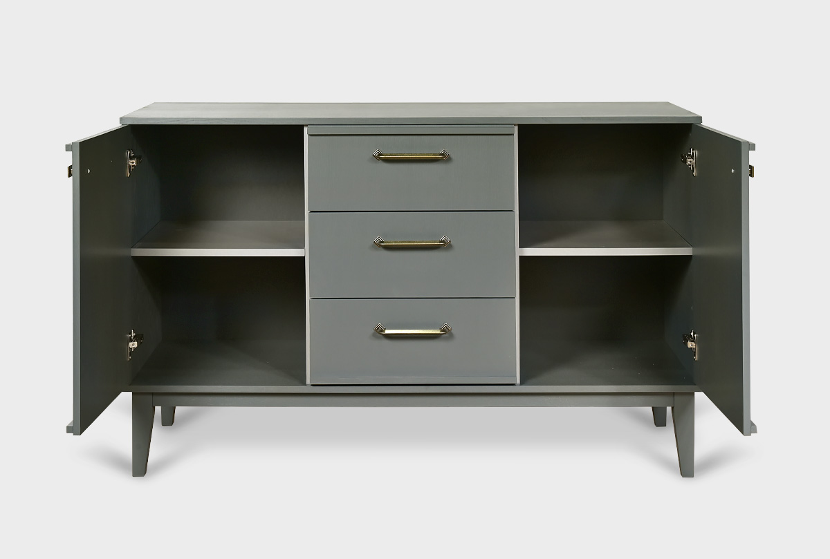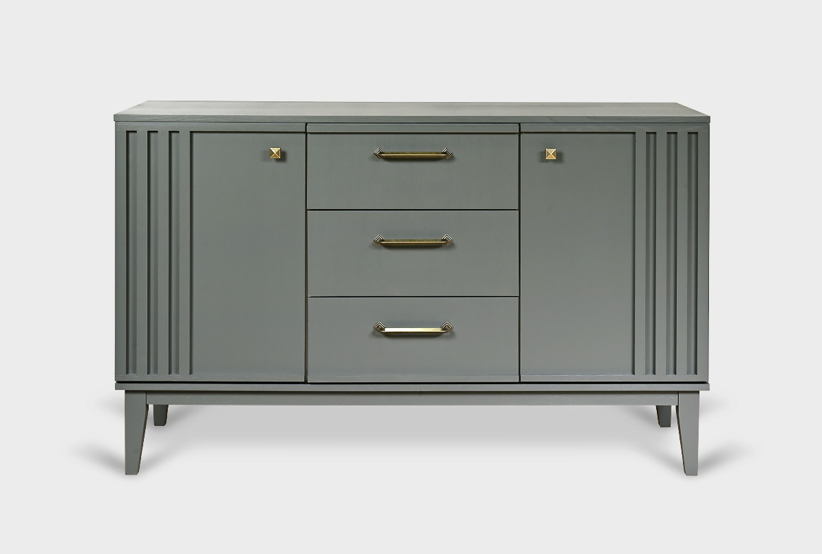Тумба трехсекционная Чикаго шириной 141 см с тремя ящиками для мелочей и полками за двумя дверцами. Тумба выполнена в цвете "платина".