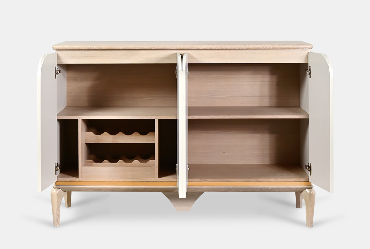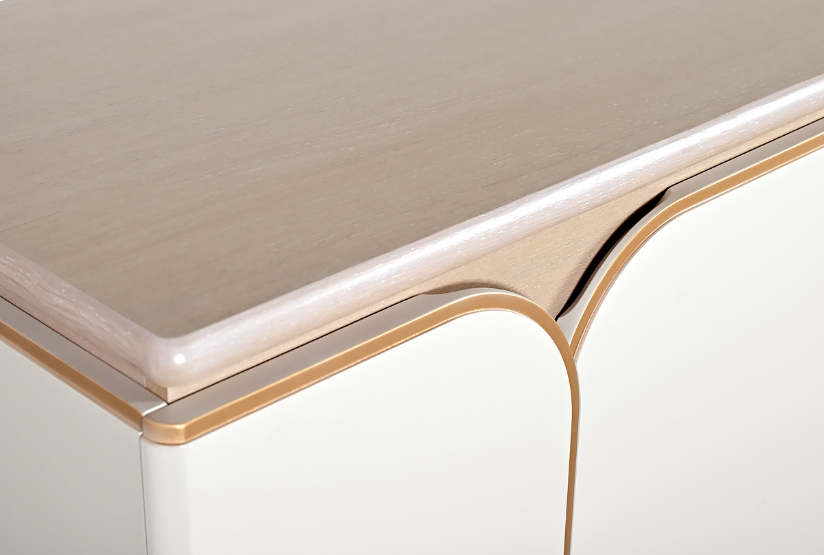 Тумба "Алекса" в цвете "айвори+жемчужный дуб, золотая патина" создана для людей, влюбленных в дизайн. Элегантность и функциональность – вот две главные составляющие этой тумбы. Если с первым отлично справляются легкие изящные линии, закругленные края фасадов, сочетание гладкого окрашенного мдф и текстуры благородного дуба, то за функциональность и комфорт отвечают отсутствие внешней фурнитуры и спрятанные выемки для удобного открывания дверей, петли с доводчиком для бесшумного закрывания и ниша для хранения бутылок. И в довершении ко всему, тумба обладает светодиодной подсветкой, благодаря которой тумба как будто парит.