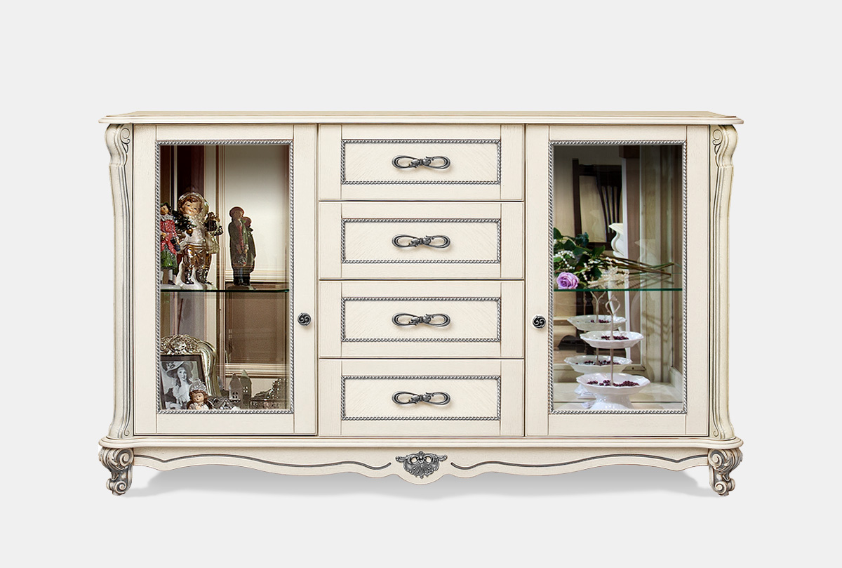 Тумба «Алези 3з» со стеклянными вставками отлично впишется как в гостиную, так и в столовую. В гостиной Вы можете поставить на нее телевизор, расставить сувениры и рамки с фотографиями, а в столовой – сложить кухонные приборы, посуду, скатерти и салфетки. Благодаря вместительным ящикам в тумбу Alezi может поместиться все то, что вы хотите спрятать от посторонних глаз, а зеркальные ниши, наоборот, помогут вам похвастаться фамильным сервизом или красивыми хрустальными бокалами перед гостями. Декоративные элементы (пилястры, инкрустация по технологии маркетри и оригинальная фурнитура) привносят завершающий штрих в «образ» тумбы.