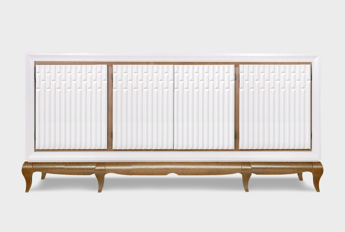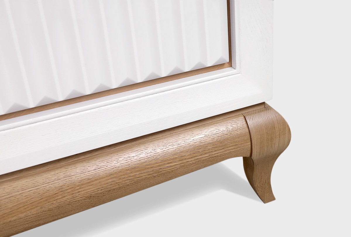 Тумба «Армония» — воплощение изысканной современно-классической эстетики. Она покоряет с первого взгляда: фрезерованные фасады с рельефным вертикальным рисунком создают игру света и тени, добавляя объём и фактурность. Изогнутые опоры и волнообразный цоколь из массива дуба придают образу нотки легкости и изящества, визуально «поднимая» тумбу над полом.