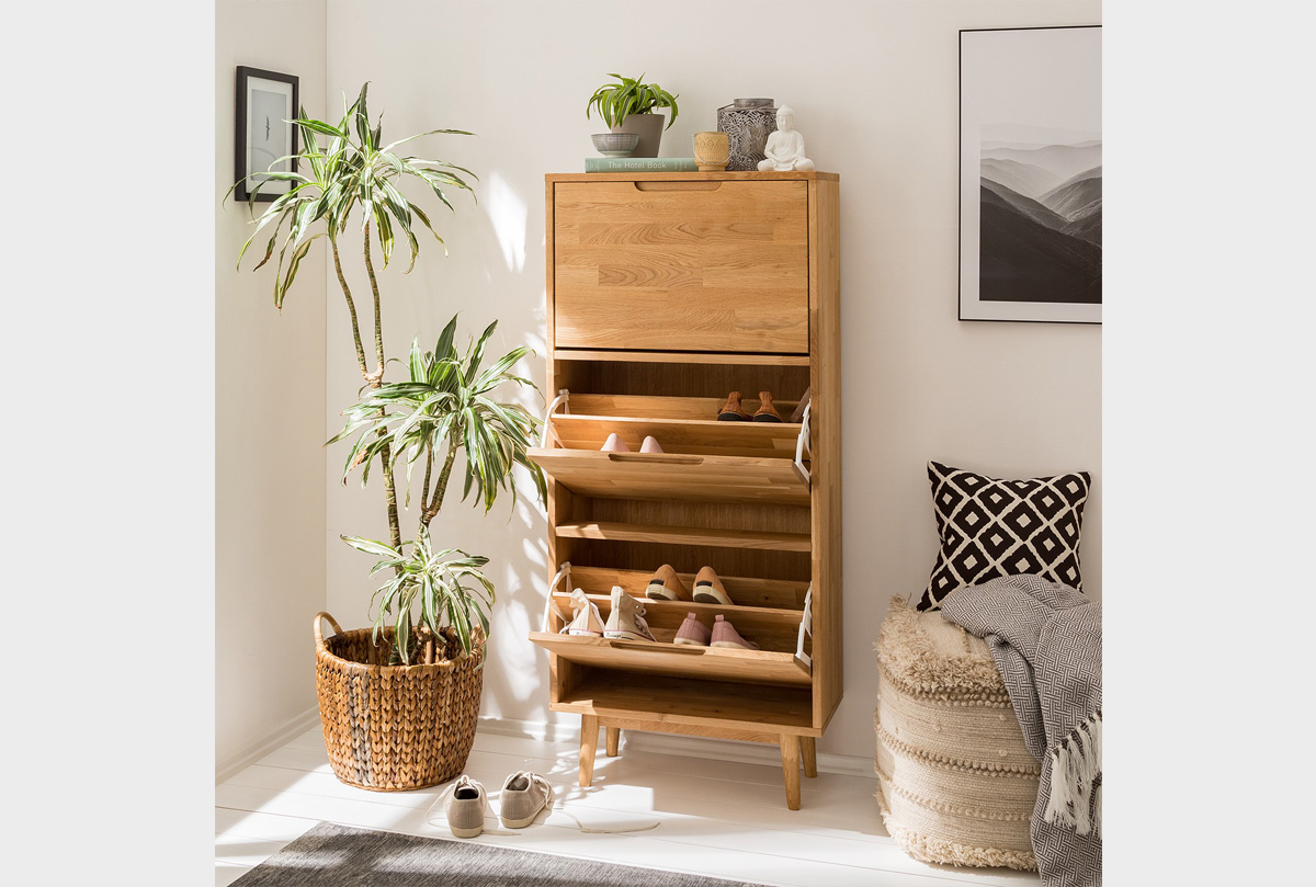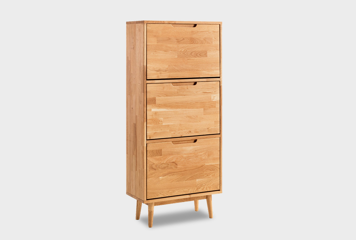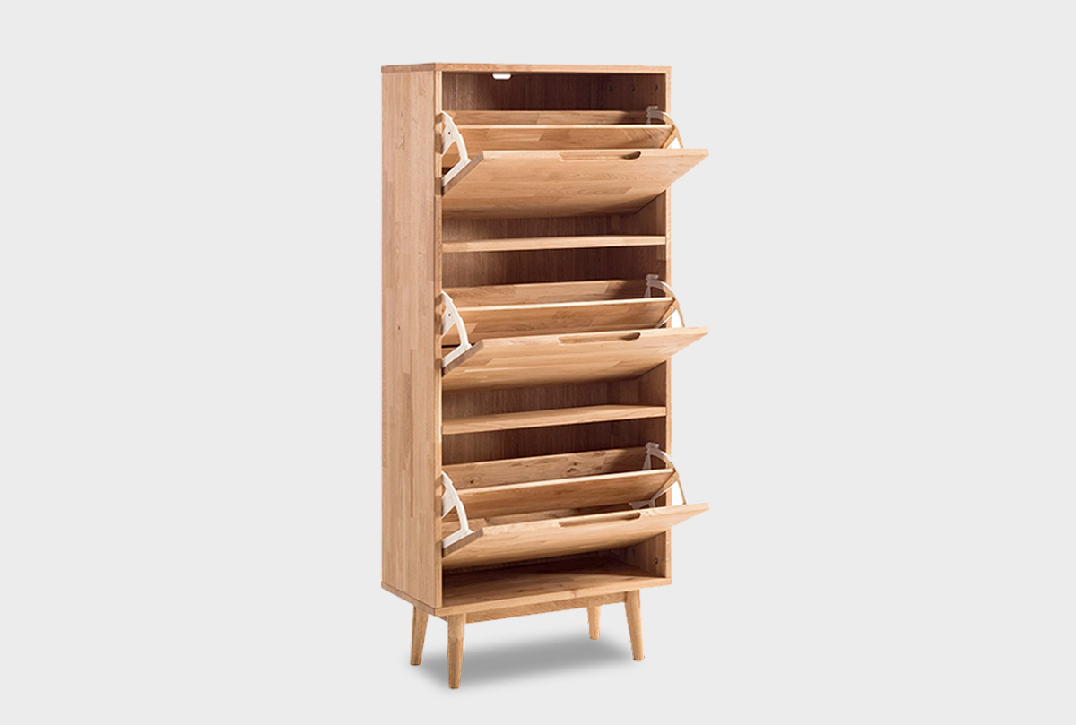 ✅ Три откидных секции на фасаде раскрываются внутрь корпуса, открывая доступ к вместительным отсекам для хранения обуви.