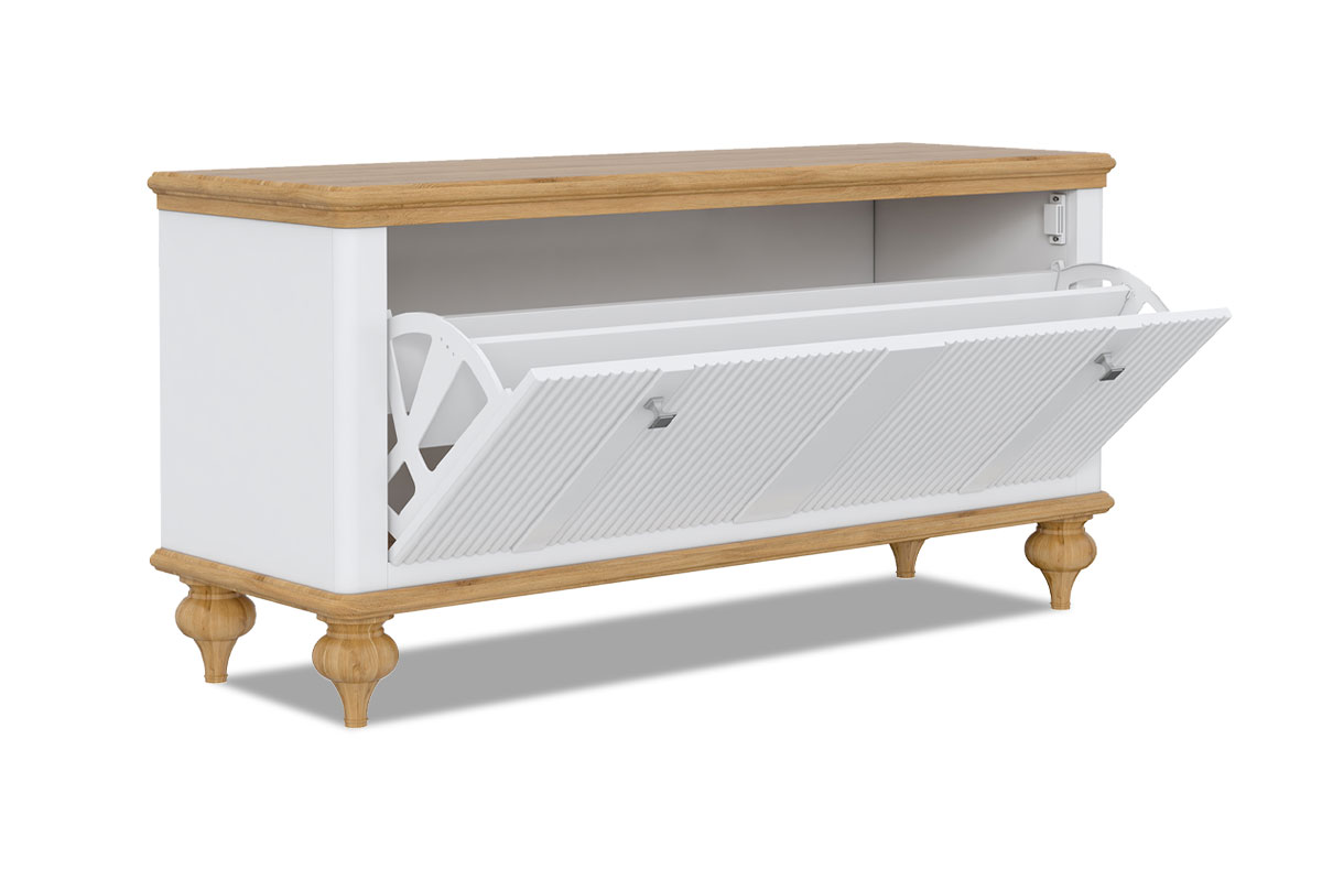Тумба для обуви «Рандеву» 10 (1 дверь) в цвете «белый лак+антик 24». Размеры (ШxВxГ) 1132 x 570 x 336 мм. Тумба сохранит в порядке весь ваш обувной гардероб. Она состоит из одного вместительного отделения. Подойдет как для прихожей в городской квартире, так и для загородного дома.