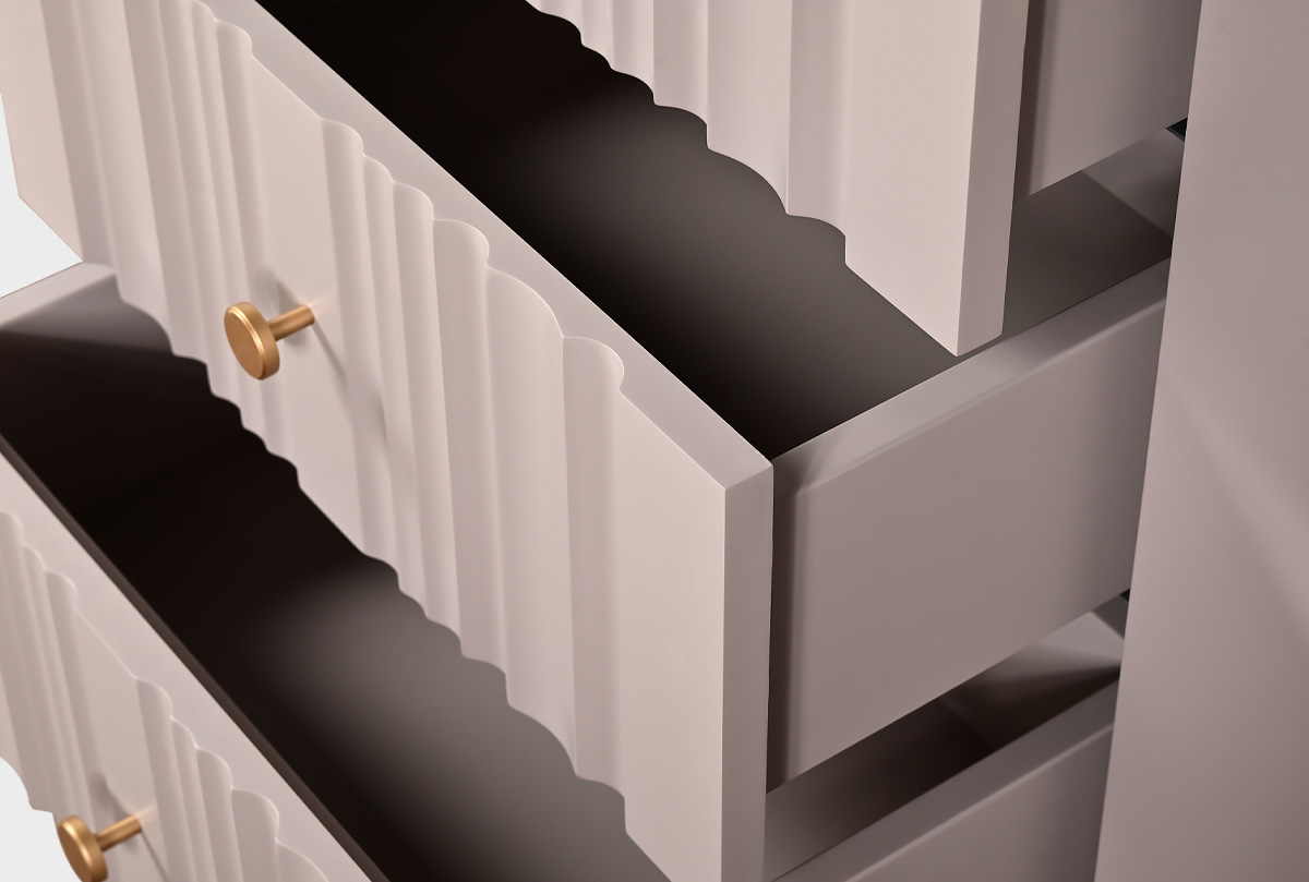 Коллекция «Меридиан» — это искусство в каждой детали. Её узнаваемый стиль формируют минималистичные формы, высокие ножки и волнообразные фасады, напоминающие изысканную драпировку атласной ткани. Добавьте к этому тонкую позолоченную фурнитуру и пастельные тона, — и вы получаете мебель, которая не просто украшает пространство, а создаёт в нём утончённое настроение.