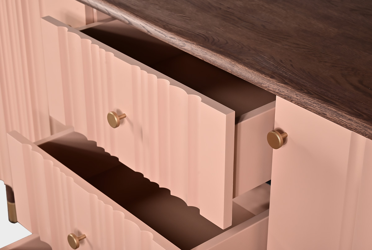Коллекция «Меридиан» — это искусство в каждой детали. Её узнаваемый стиль формируют минималистичные формы, высокие ножки и волнообразные фасады, напоминающие изысканную драпировку атласной ткани. Добавьте к этому тонкую позолоченную фурнитуру и пастельные тона, — и вы получаете мебель, которая не просто украшает пространство, а создаёт в нём утончённое настроение.