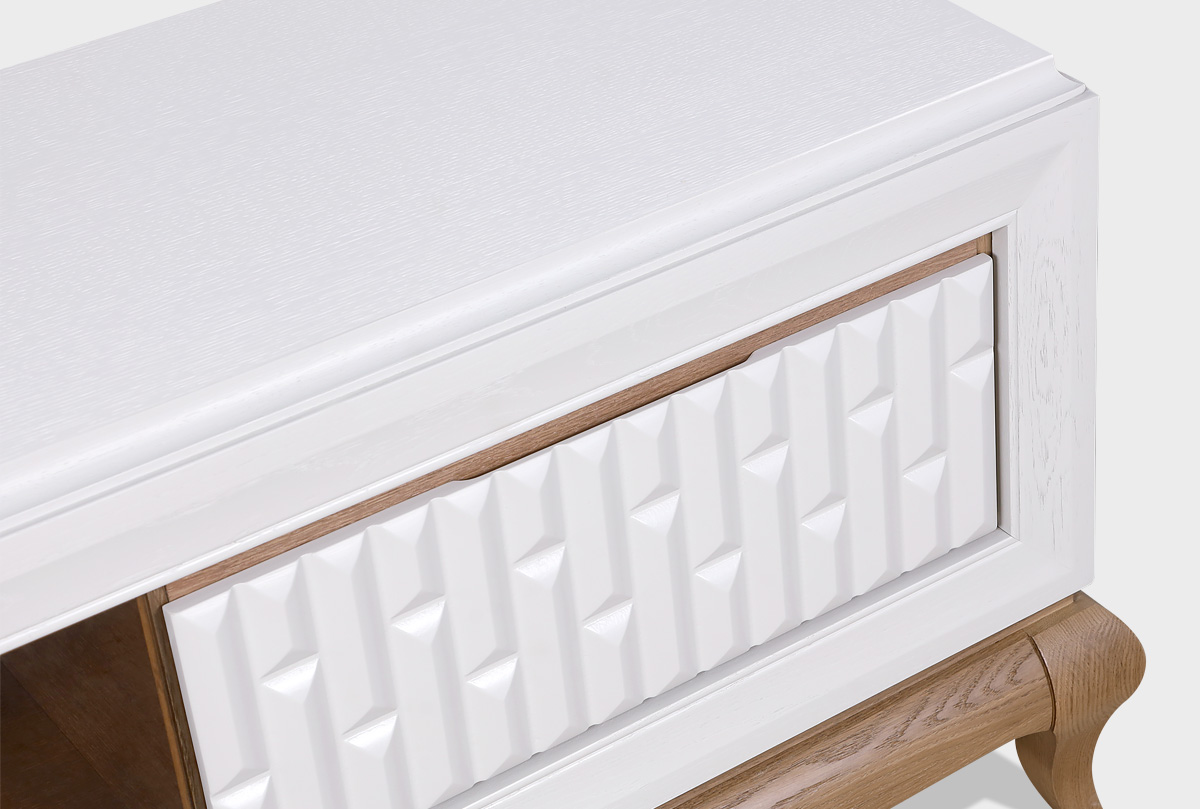 ✅ По бокам — выдвижные ящики с фрезерованными фасадами, которые не только эффектно смотрятся, но и служат вместительными зонами хранения для пультов, кабелей, аксессуаров. Дно ящиков отделано велюром.