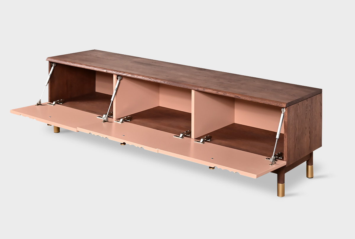 Тумба «Меридиан» 180 визуально вытягивает горизонт, уравновешивая композицию стены с телевизором. Она прекрасно смотрится как в светлом, так и в тёмном интерьере, придавая зоне отдыха ощущение завершённости. Высокие ножки визуально облегчают конструкцию, а волнообразный фасад добавляет декоративности даже при выключенном экране.