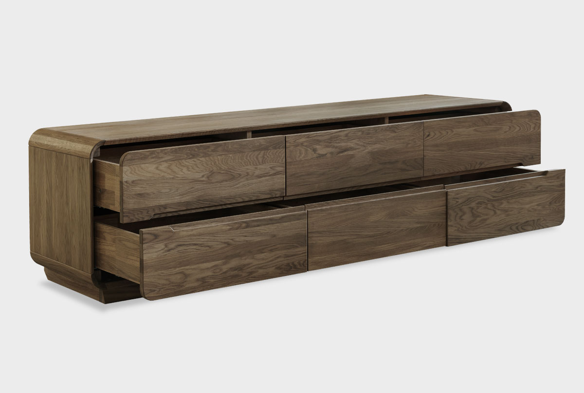 ✅ Изделие оснащено 6 вместительными выдвижными ящиками, в которых удобно хранить кабели, пульты, журналы, диски или даже текстиль. Глубина ящиков — 385 мм.