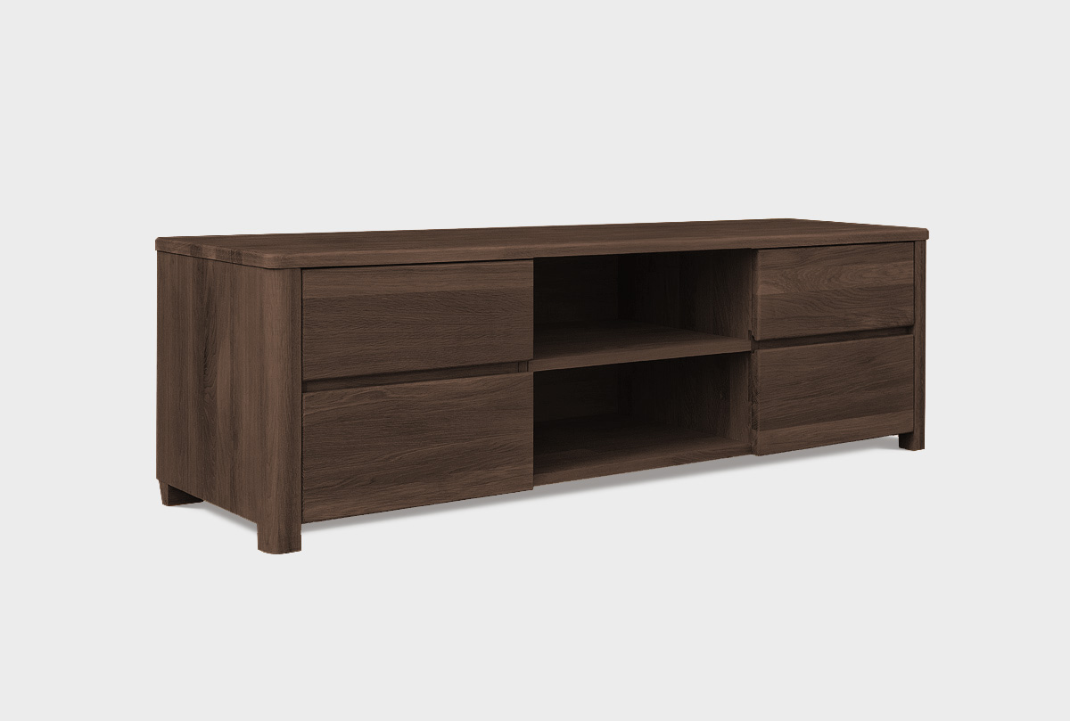 Тумба под ТВ «Норд» в цвете «графит» - это сочетание простоты, элегантности и лаконичности. Покрытие бейц-маслом подчеркивает природную красоту массива дуба: это делает тумбу универсальным предметом мебели и позволяет Вам сочетать ее с мебелью практически в любом стиле. Оптимальная высота тумбы позволит смотреть телевизор с комфортом, не напрягая глаза. Благодаря функциональному наполнению она может служить и как дополнительное место для хранения: четыре выдвижных ящика вместят нужные мелочи, а две ниши – аудио и видео технику.
