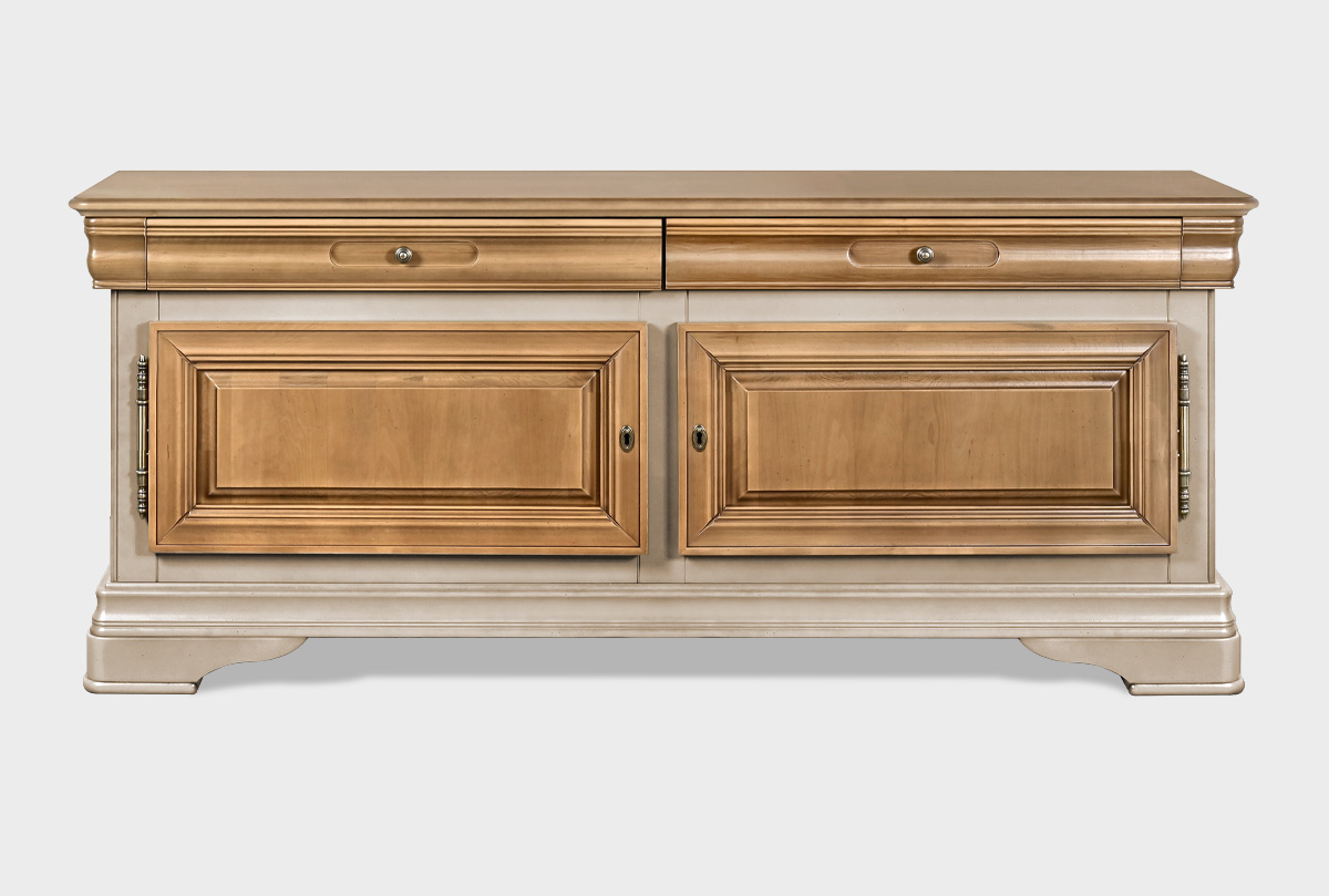Двухдверная тумба под ТВ «Оливия» в цвете «пудра» из массива и шпона ольхи прекрасно впишется в гостиную как загородного дома, так и любой квартиры.