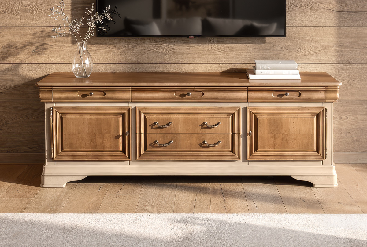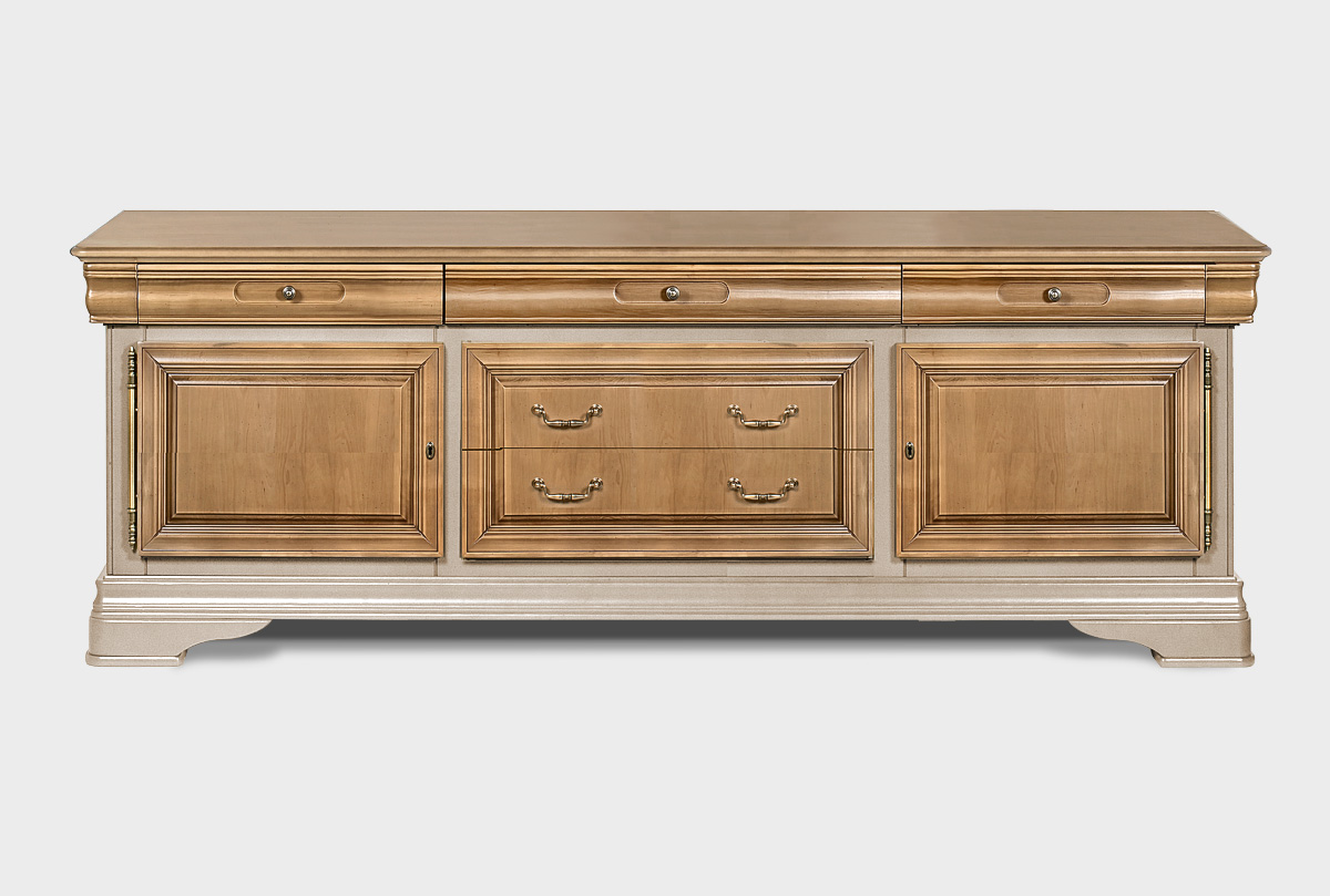 Трехдверная тумба под ТВ «Оливия» в цвете «пудра» из массива и шпона ольхи прекрасно впишется в гостиную как загородного дома, так и любой квартиры.