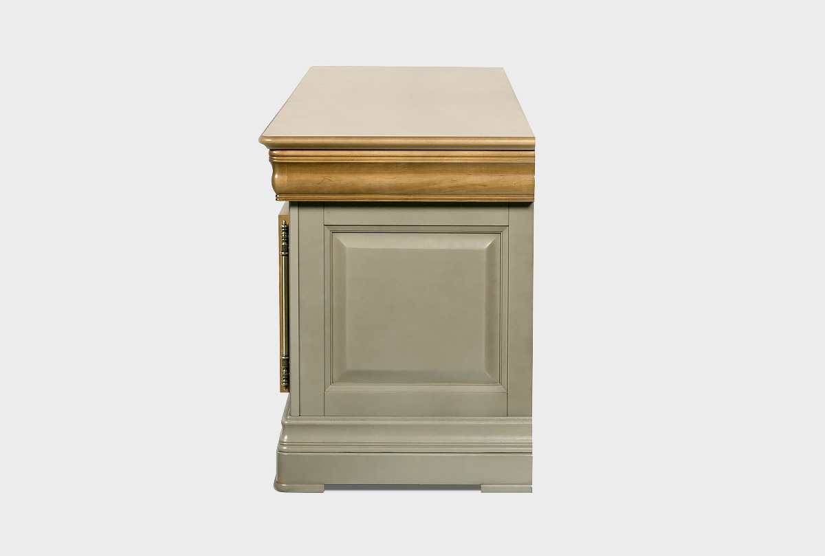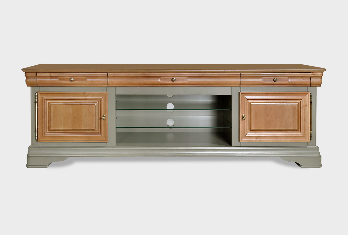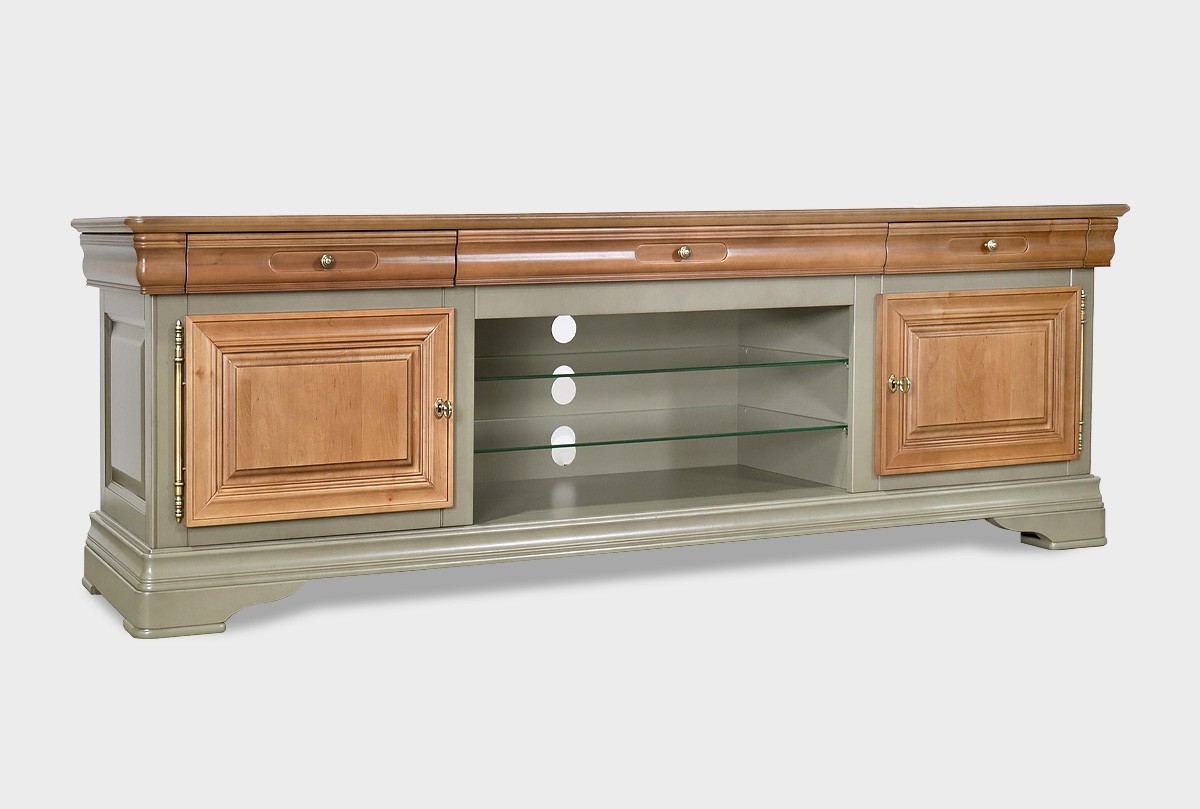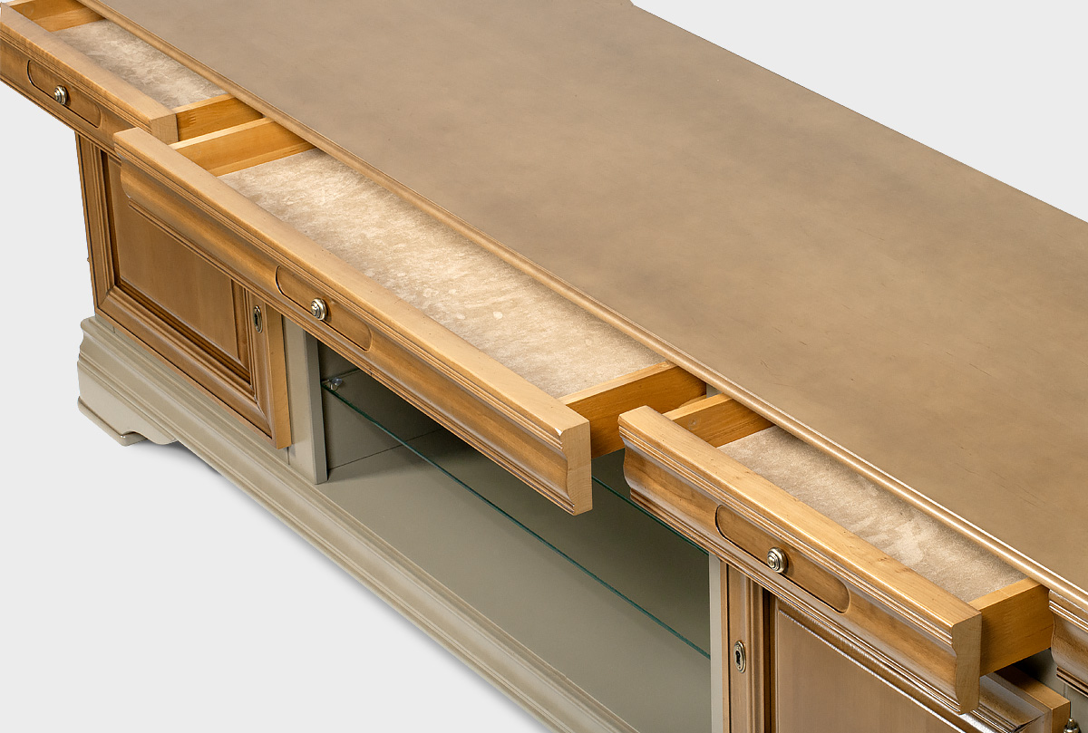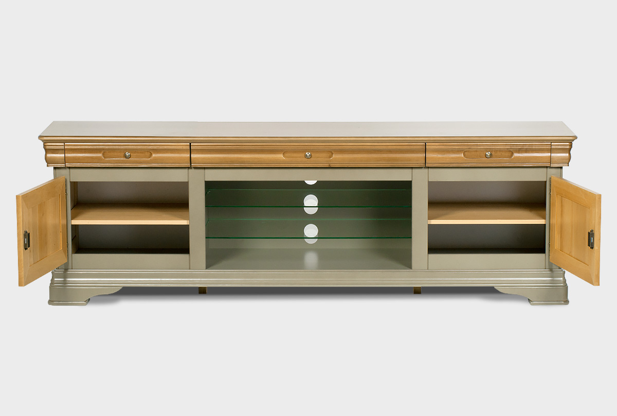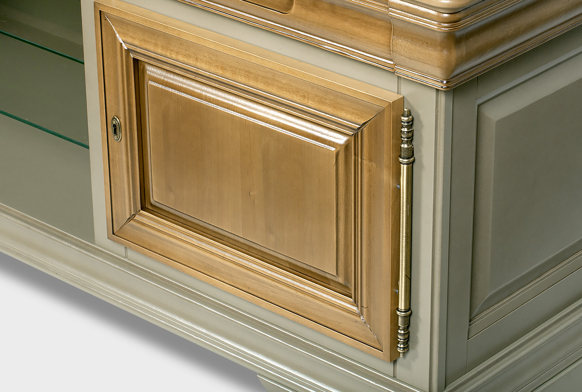 Выполненная из массива и шпона ольхи несравненная тумба под ТВ «Оливия» с нишей в цвете «олива» прекрасно впишется в гостиную как загородного дома, так и любой квартиры. Она элегантна и изысканна. Ее ширина позволяет разместить самые современные телевизоры, а на стеклянных полках можно удобно расположить всю аппаратуру. Более того ТВ тумба обладает тремя выдвижными ящиками, деликатно вписанными в столешницу и двумя нишами за закрытыми дверьми.