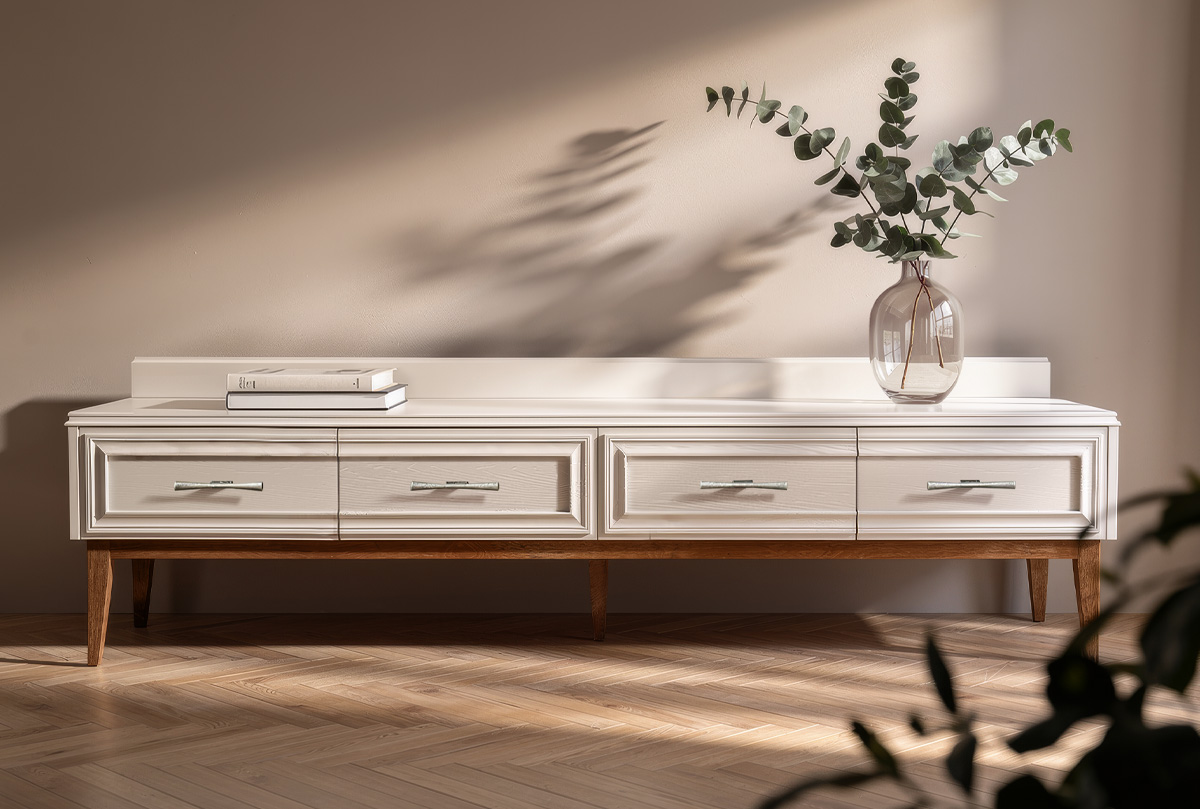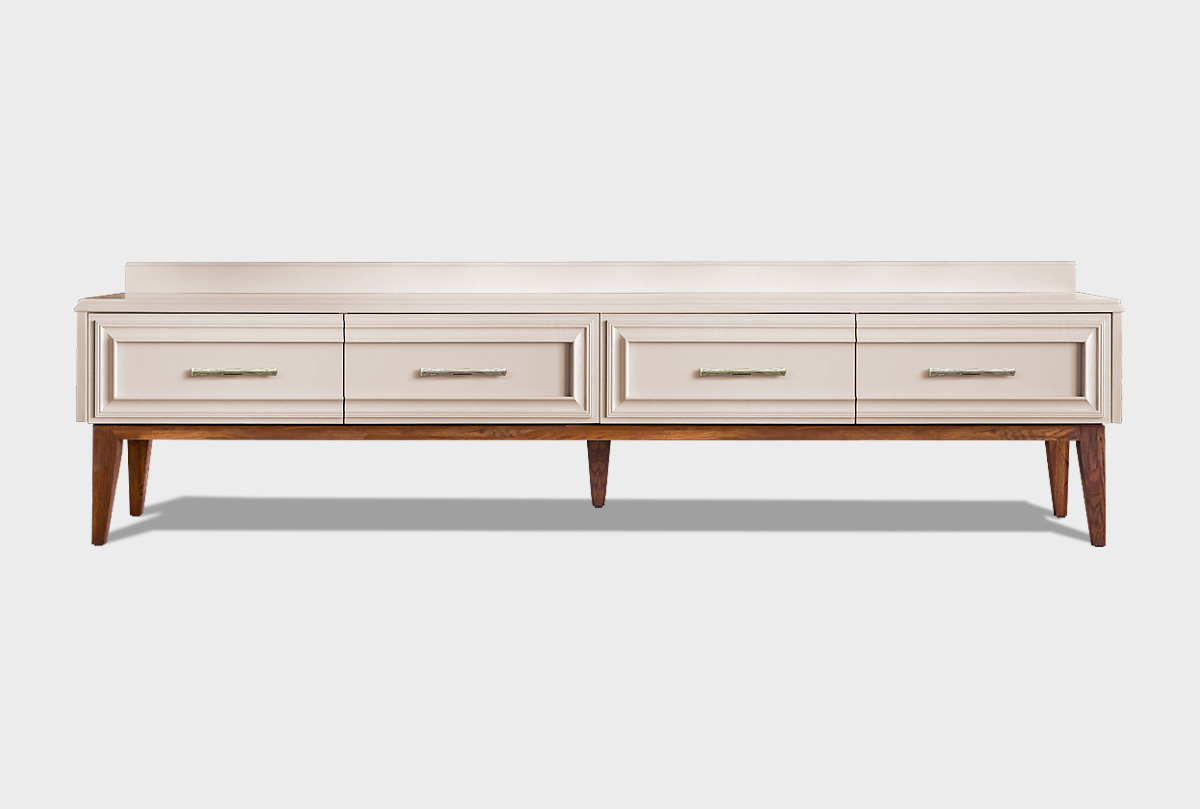 Тумба под ТВ «Сакраменто» 4 ящика в цвете «марципан, орех» из дуба. в стиле современной американской классики для Вашей гостиной.
