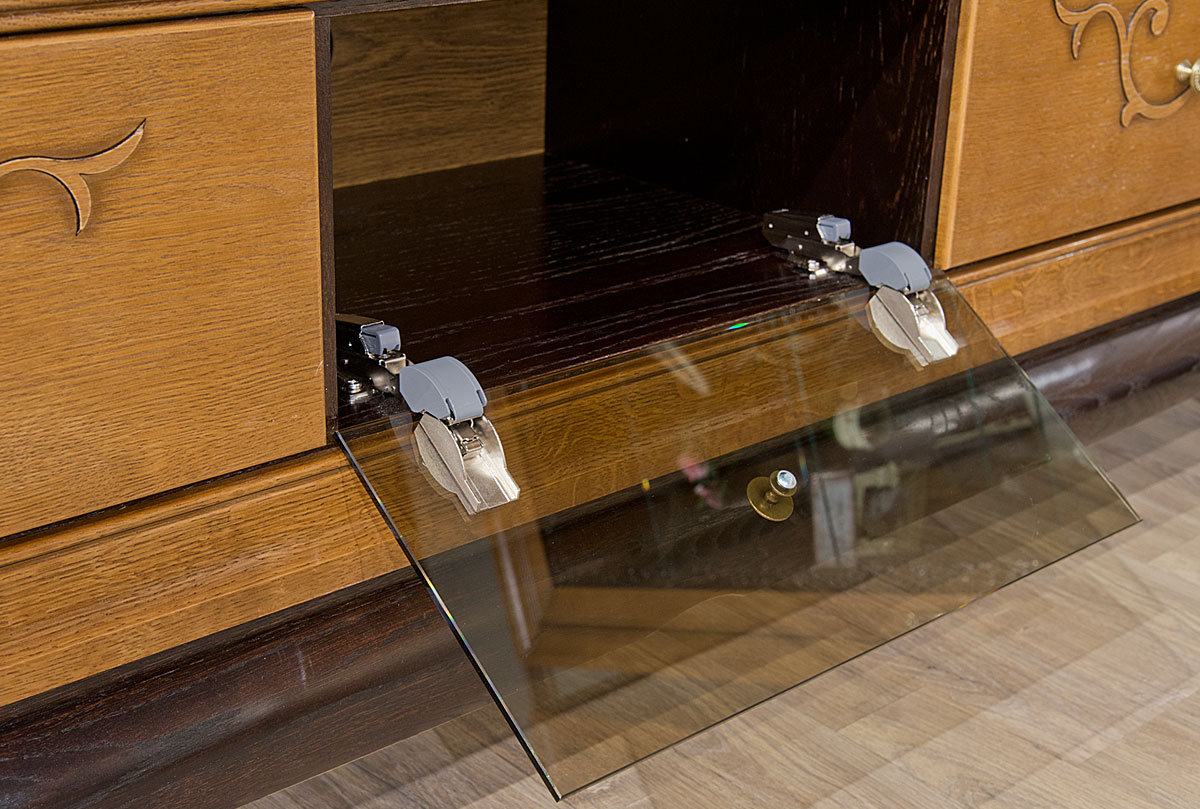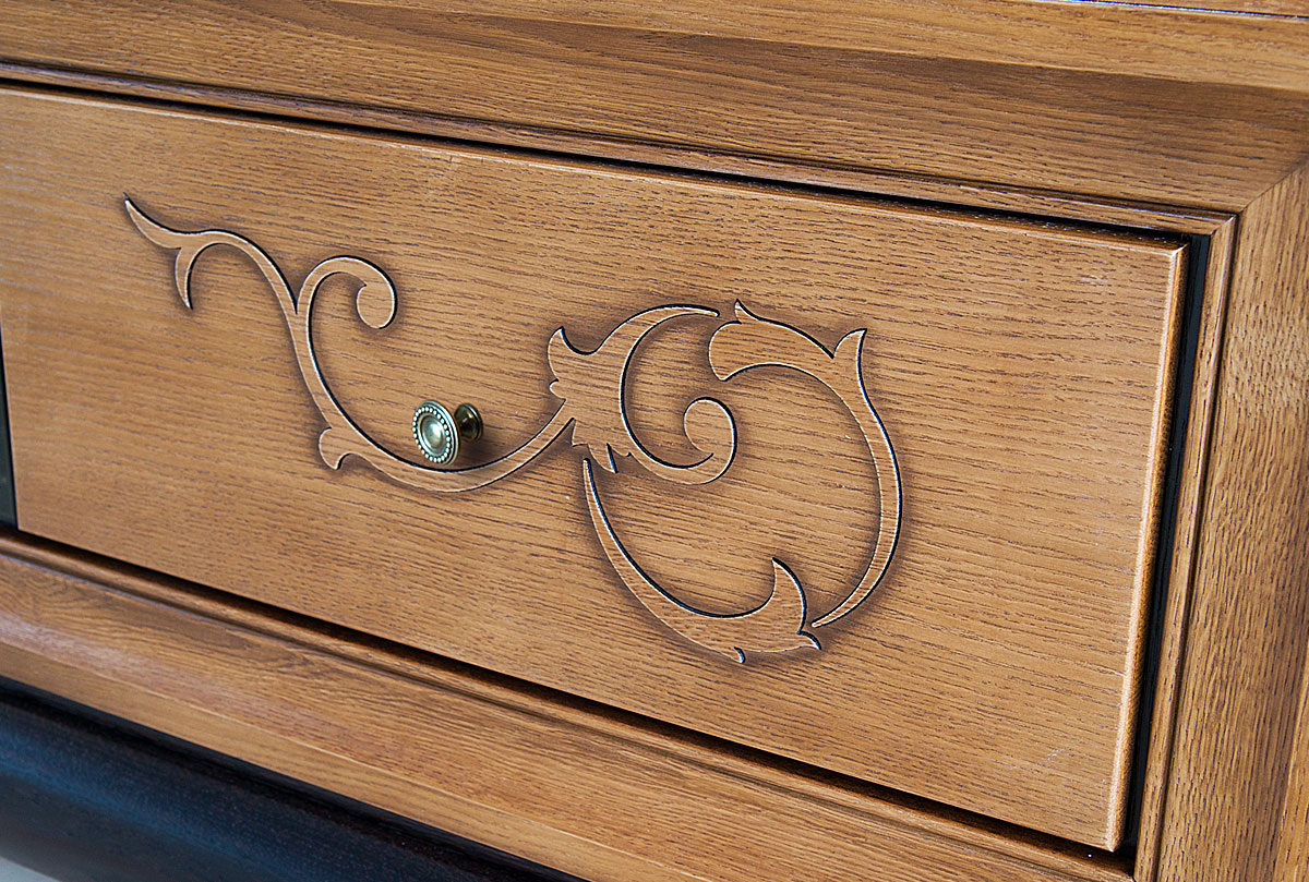Два вместительных выдвигающихся ящика послужат Вам для хранения разных мелочей. Инкрустация в виде орнамента гармонично дополняет «образ», а тонированное стекло - ненавязчивый, но практичный элемент декора, завершает оформление этой тумбы.