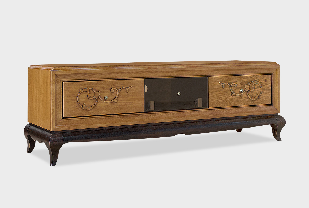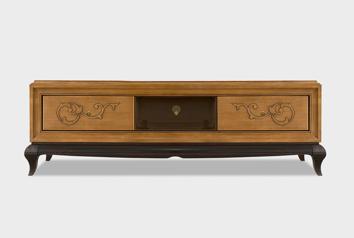 Массивная тумба под ТВ «Соната» (Sonata) в цвете «коньяк с тёмной патиной+горький шоколад» идеально впишется в интерьер гостиной в итальянском стиле. Изготовленная из массива и шпона дуба она непременно займет место не только в доме, но и в Вашем сердце.