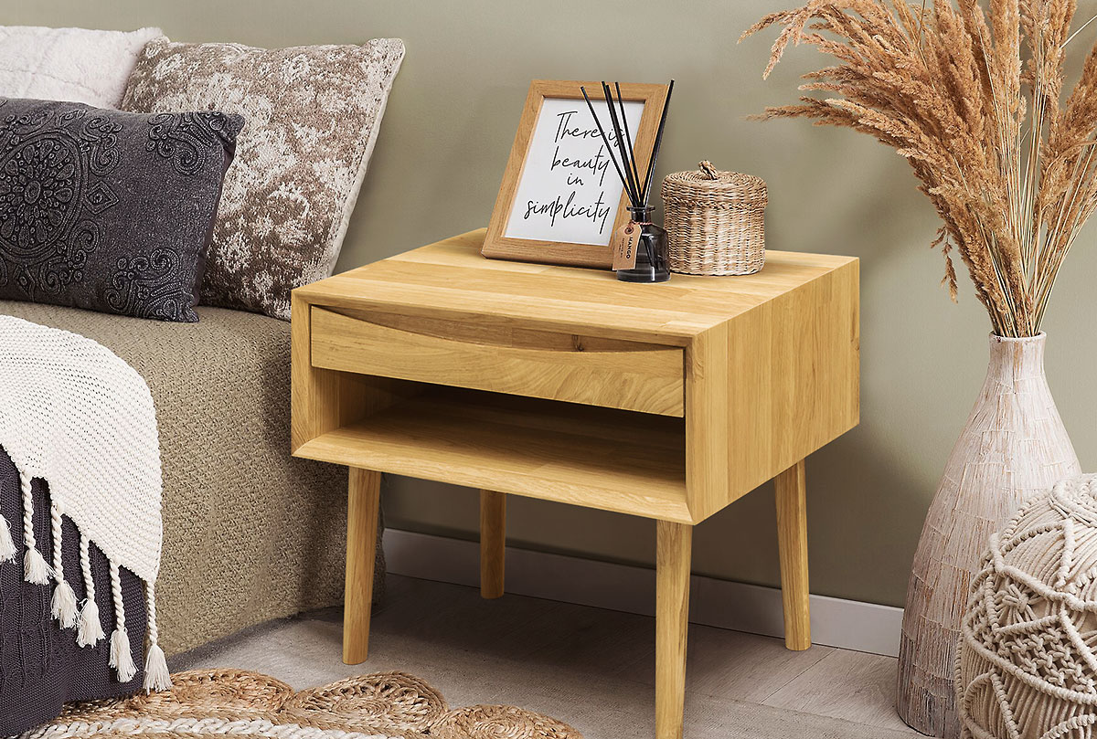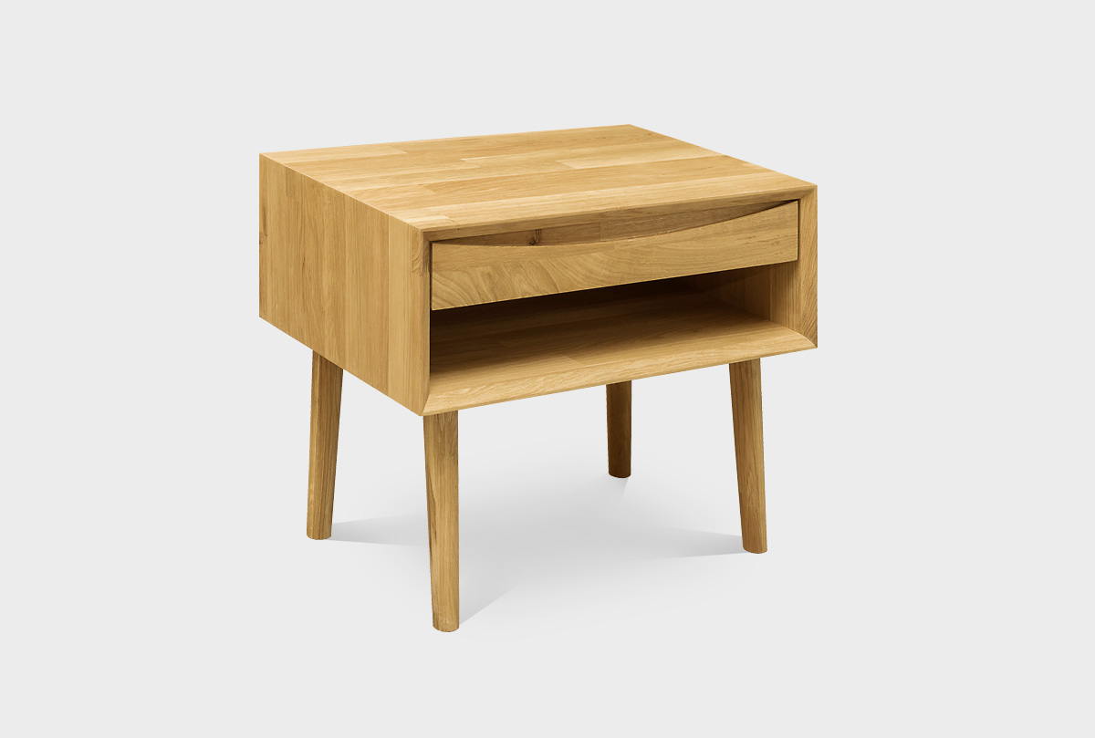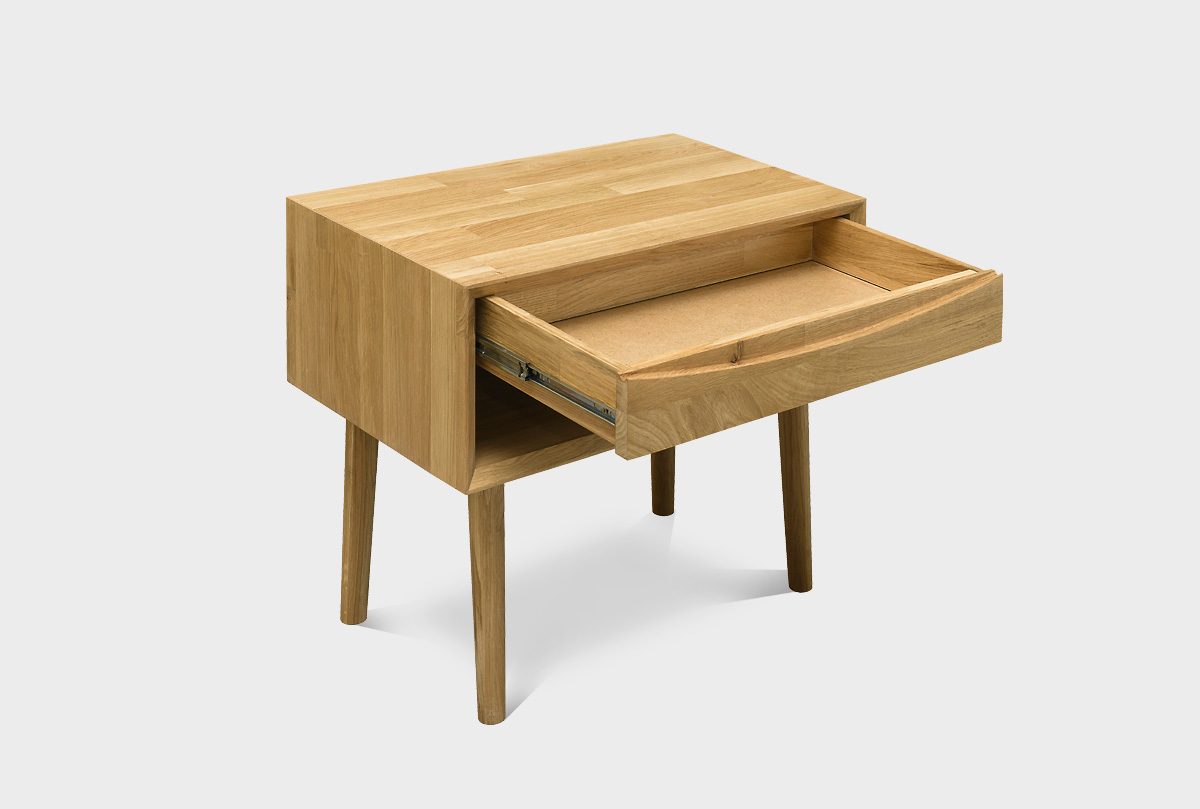 Тумба прикроватная «Ирвинг» (с нишей) — воплощение утончённости и практичности в духе модерна середины века. Тумба визуально лёгкая, с тонкими, изящно сужающимися ножками и минималистичным корпусом. Лаконичный дизайн без лишних деталей подчёркивает натуральную текстуру дуба.