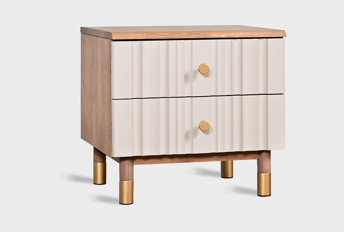 Прикроватная тумбочка «Меридиан» с двумя ящиками изготовлена из дуба. Корпус выполнен в цвете «торфяной дуб», а фасад — в цвете «панна котта».