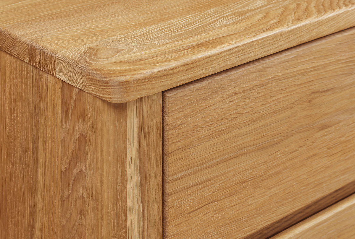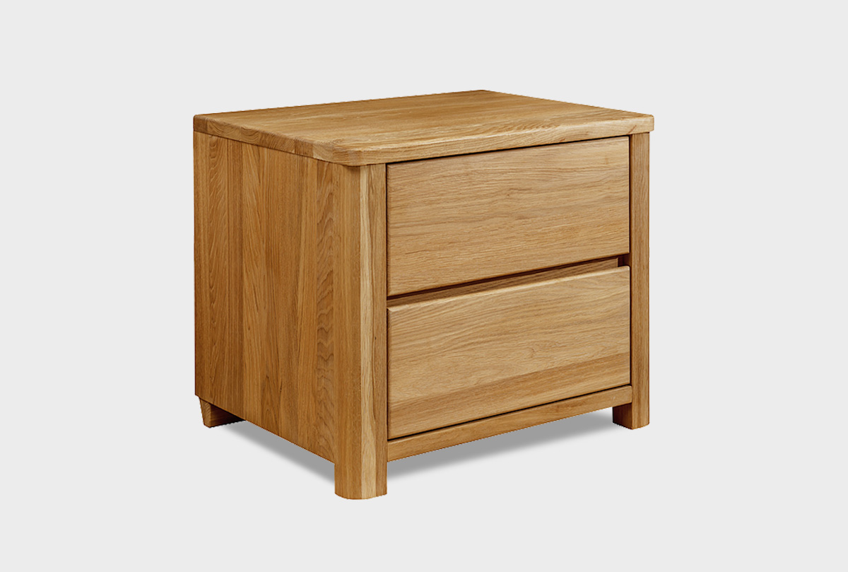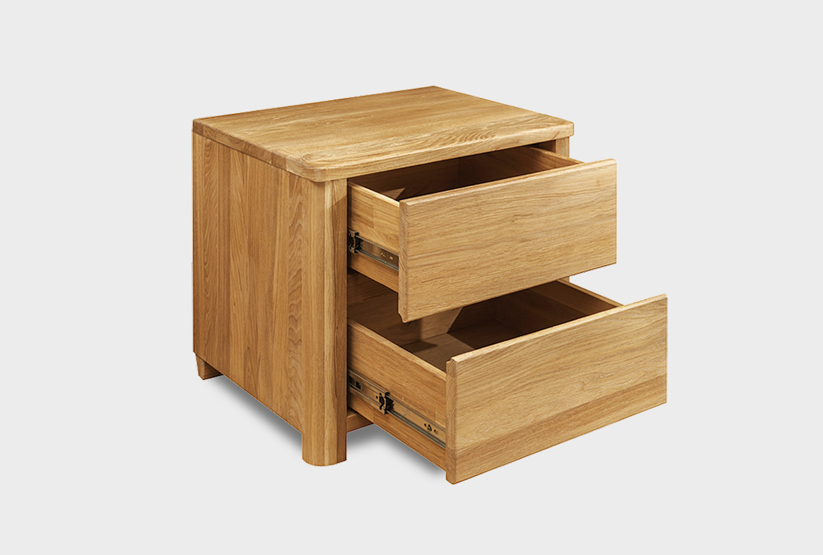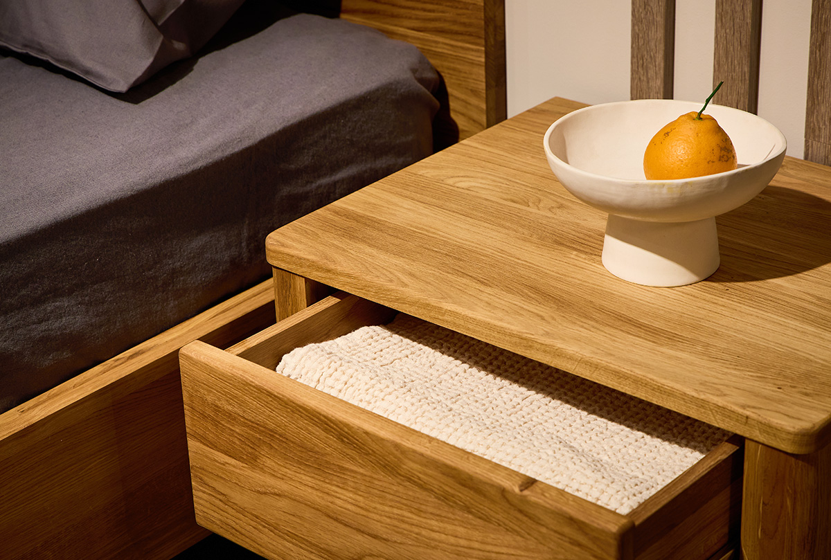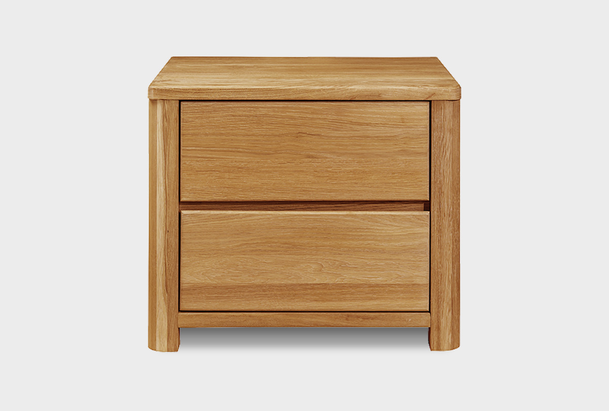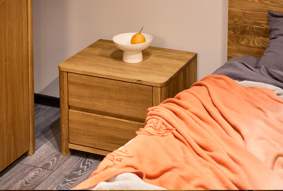 Прикроватную тумбу «Норд» в цвете «бейц-масло» отличают чистота линий и функциональность: она отличается закругленными краями и надежными направляющими полного выдвижения с качественными немецкими доводчиками. Лаконичные фасады выдвижных ящиков не имеют ручек, но такой минималистический стиль находится на пике мебельной моды. Тумба выполнена из дубовых брусков, которые нарочито не подобраны по рисунку, при этом дерево пропитано только бейц-маслом.