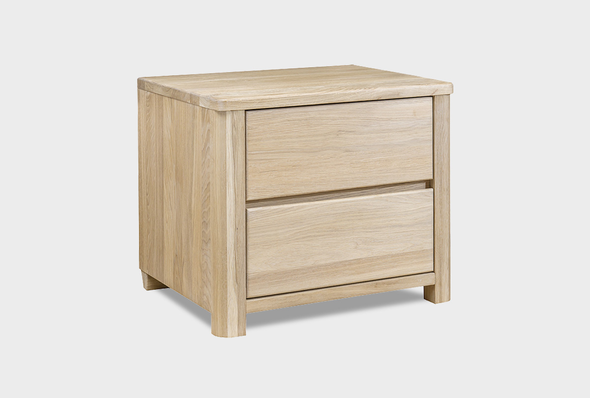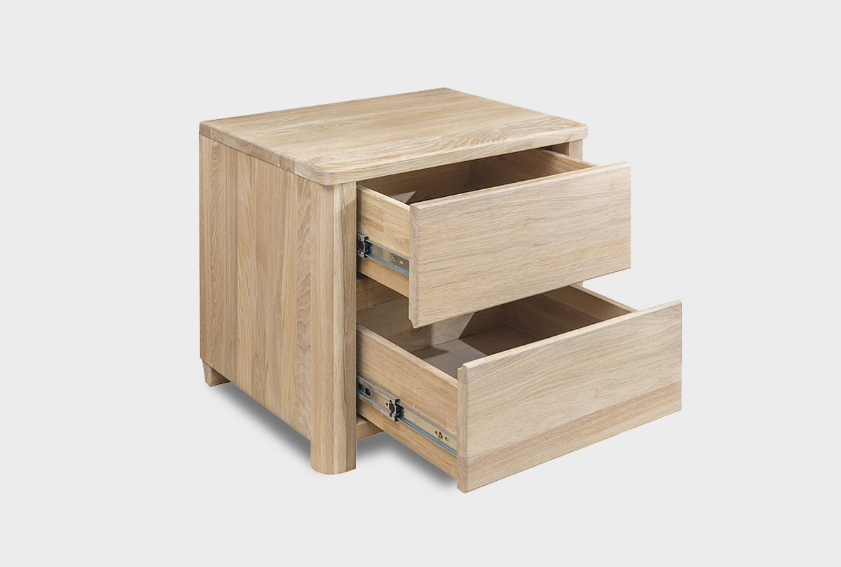 Прикроватную тумбу «Норд» в цвете «белёный дуб» отличают чистота линий и функциональность: она отличается закругленными краями и надежными направляющими полного выдвижения с качественными немецкими доводчиками. Лаконичные фасады выдвижных ящиков не имеют ручек, но такой минималистический стиль находится на пике мебельной моды. Тумба выполнена из дубовых брусков, которые нарочито не подобраны по рисунку, при этом дерево пропитано только бейц-маслом.