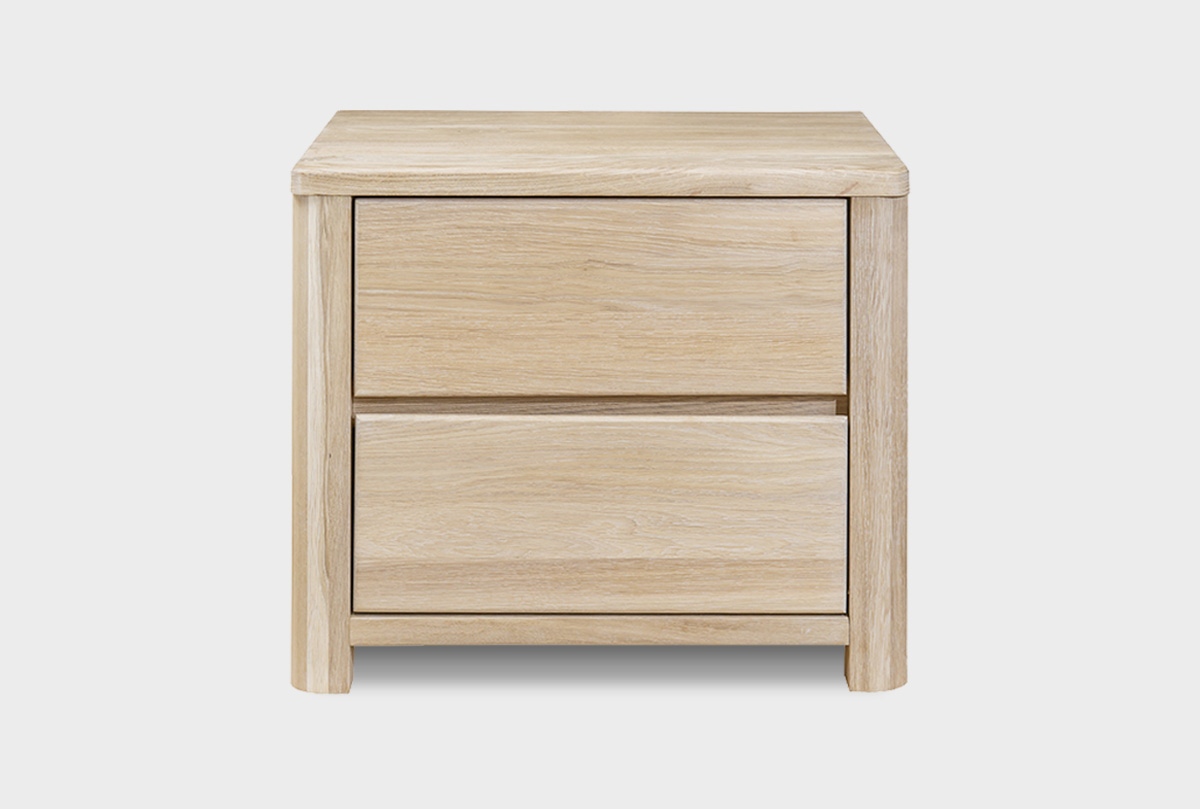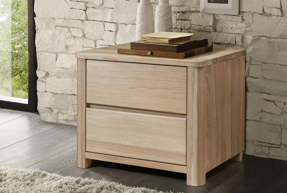 Прикроватную тумбу «Норд» в цвете «белёный дуб» отличают чистота линий и функциональность: она отличается закругленными краями и надежными направляющими полного выдвижения с качественными немецкими доводчиками. Лаконичные фасады выдвижных ящиков не имеют ручек, но такой минималистический стиль находится на пике мебельной моды. Тумба выполнена из дубовых брусков, которые нарочито не подобраны по рисунку, при этом дерево пропитано только бейц-маслом.