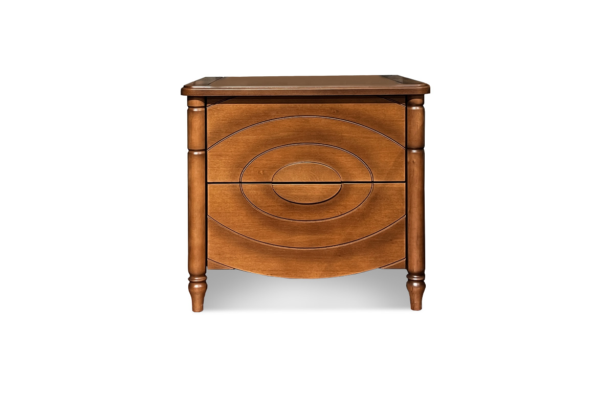 Прикроватная тумба «Офелия» выполнена из массива и шпона ольхи. Она станет незаменимым элементом вашей спальни. Благодаря высоким ножкам тумбочка выглядит легкой и воздушной. Ее уникальные фасады в виде повторяющихся овалов и скругления в деталях подарят любому интерьеру мягкость и утонченность.