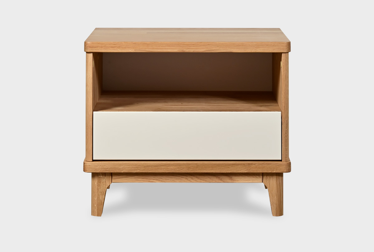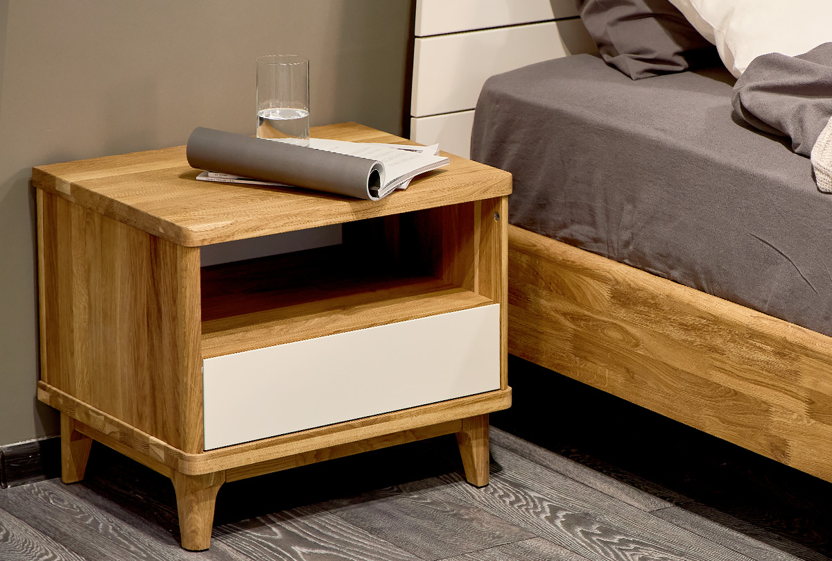 Прикроватная тумба с нишей Уоллстрит в цвете «к-бейц-масло, ф-белый, п-бейц-масло» выполнена в современном стиле Лофт с сочетанием текстуры натурального дерева и акцентных вставок. Оттенок изделия придаст помещению атмосферу упорядоченности и спокойствия. А покрытие натурального дерева исключительно бейц-маслом придаст вам уверенности в том, что для себя и своих близких вы выбираете только самое лучшее! Тумба прикроватная отлично подойдёт для спальни, а также детской или подростковой комнаты.