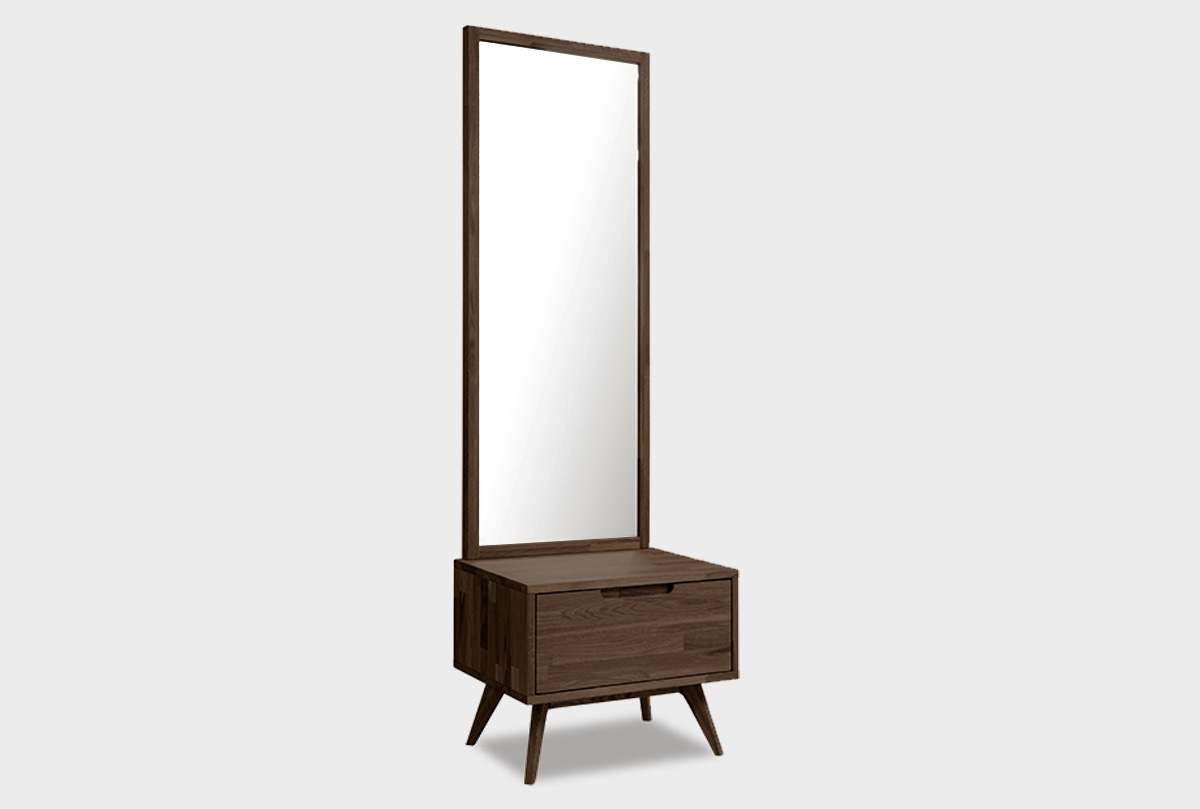 Тумба с зеркалом из коллекции «Ирвинг» — это идеальное решение для прихожей, сочетающее в себе лаконичную эстетику 50–70-х годов и современную функциональность. Элегантный силуэт, выполненный из 100% массива дуба, подчёркнут тонкими ножками и компактным корпусом, благодаря чему изделие визуально "парит" в пространстве и не утяжеляет интерьер.