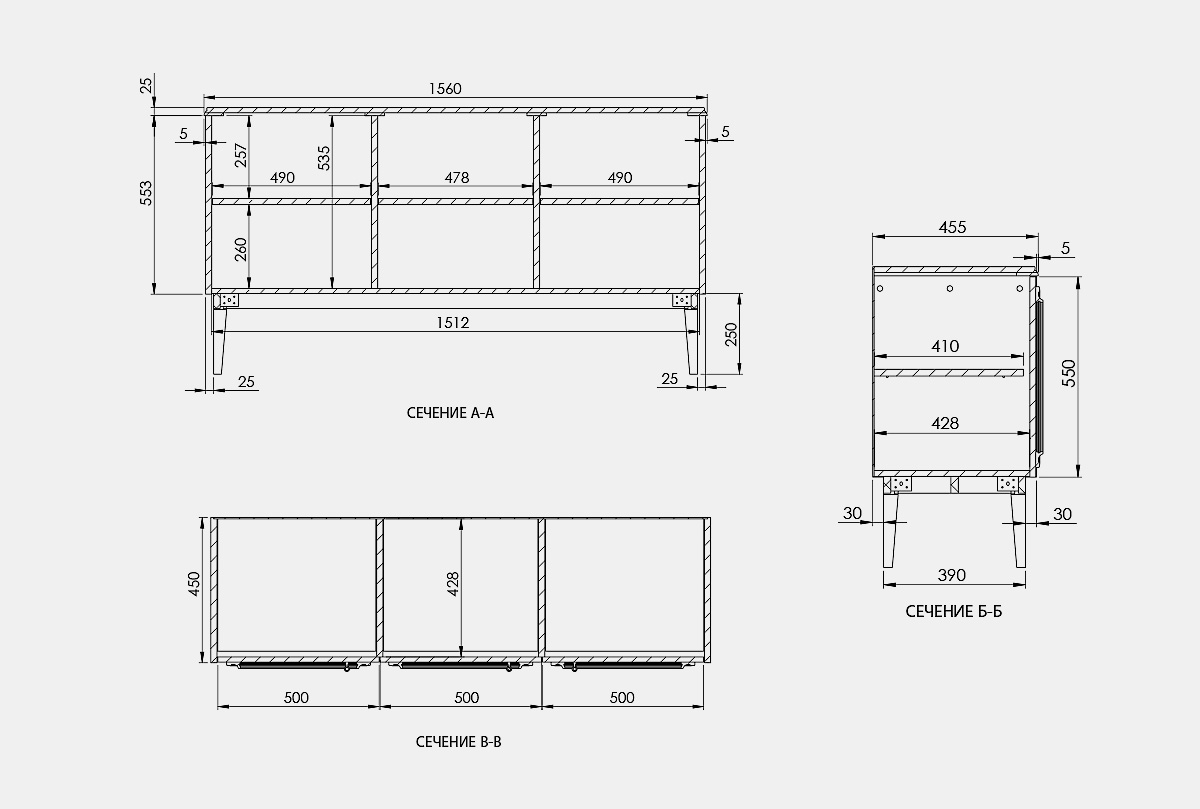 ✅ Размеры: ширина — 1560 мм, глубина — 455 мм, высота — 830 мм.