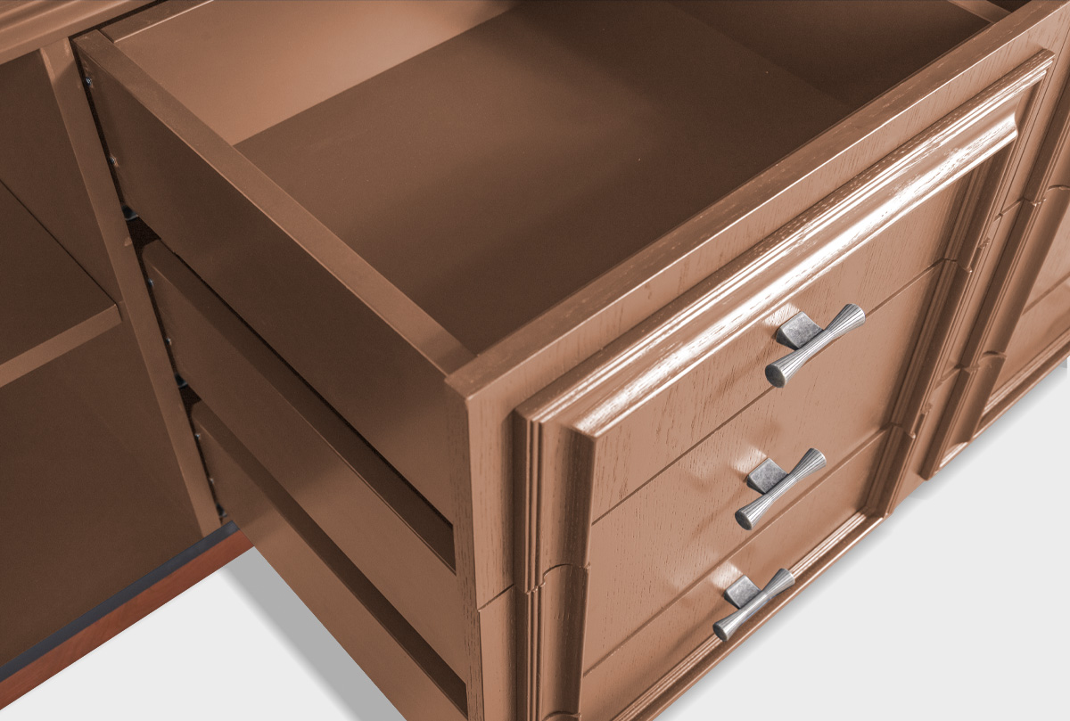 ✅ По центру расположены три вместительных выдвижных ящика с направляющими скрытого монтажа с доводчиками (Европейского пр-ва) , которые подойдут для хранения документов или аксессуаров.
