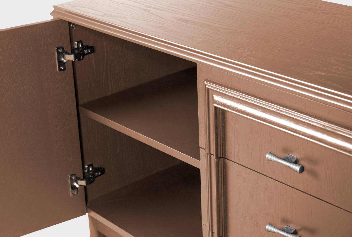 ✅ Слева и справа — два закрытых отделения с полками, каждая из которых делит пространство на две равные секции по высоте (260 мм). Эти полки отлично подойдут для хранения книг, сервизов или декоративных коробов. Дверцы имеют петли с доводчиками (Европейского пр-ва), что обеспечит плавное открывание и бесшумное закрывание.