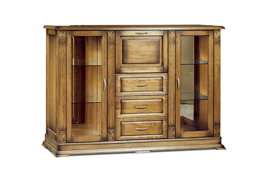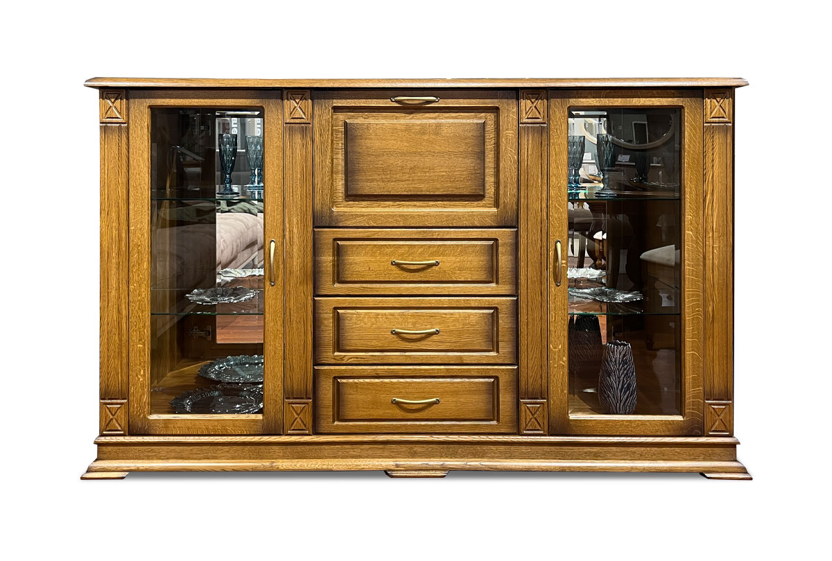 Тумба «Верди Люкс 3/2з» привлекает своей роскошью и изяществом. Несмотря на свои размеры, изделие отличается утонченностью благодаря декоративной резьбе на пилястрах. Стеклянные полки в сочетании со стеклами в боковых секциях создают красивую игру света. На них Вы можете поставить хрустальные бокалы или фамильный сервиз. Три выдвижных ящика и секретер-бар с откидной крышкой придают тумбе основательность и функциональность, а фигурный цоколь подчеркивает изысканность, свойственную классическому стилю.