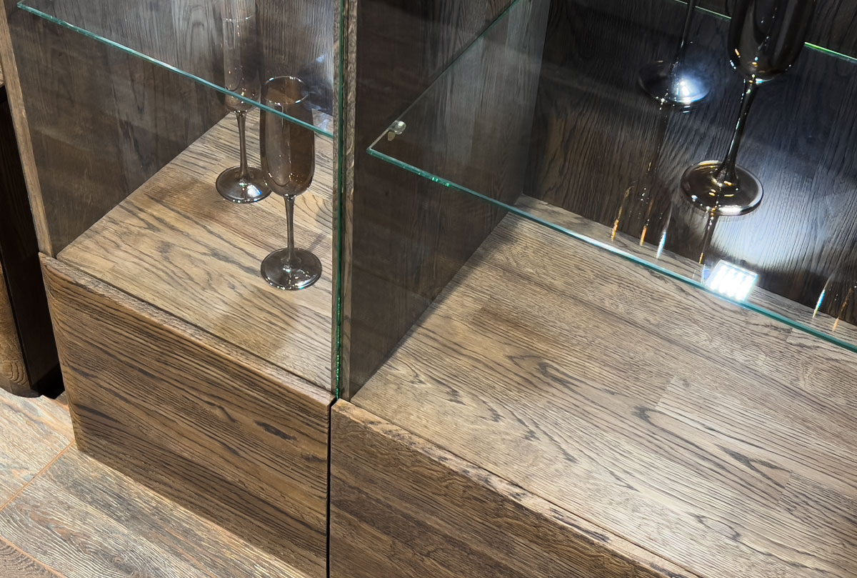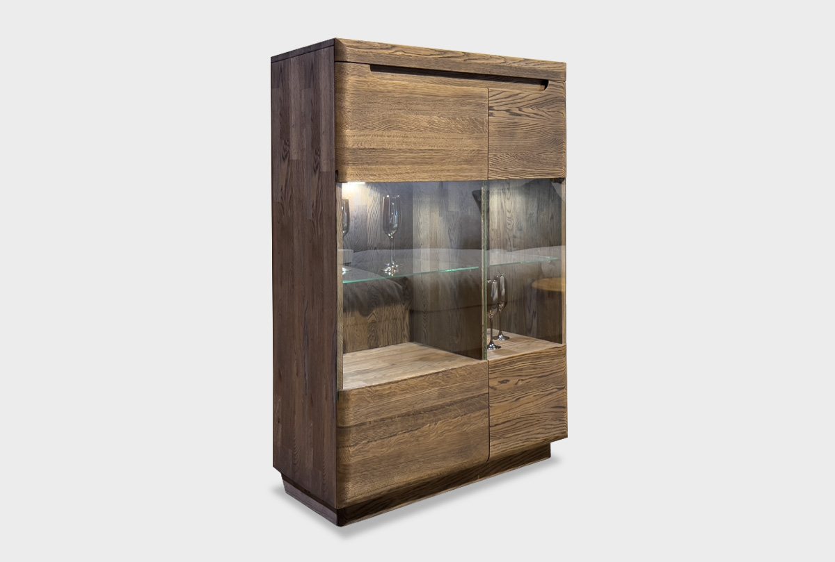 ✅ Фасадная часть украшена вставками из стекла, придающими лёгкость массивной конструкции и визуальный доступ к хранящимся предметам.
