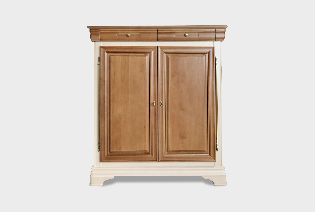 Высокая двухдверная тумба «Оливия» в цвете «пудра» выполненна в классическом стиле из массива и шпона ольхи.