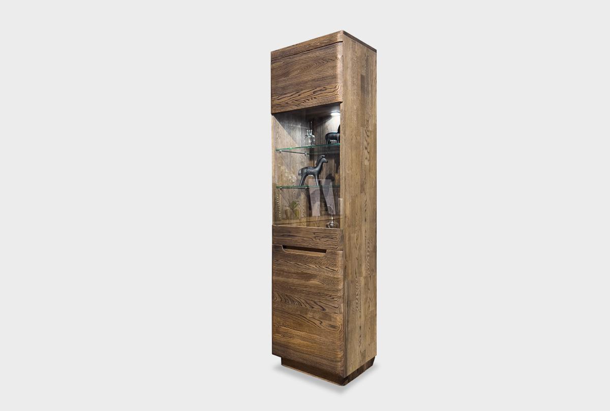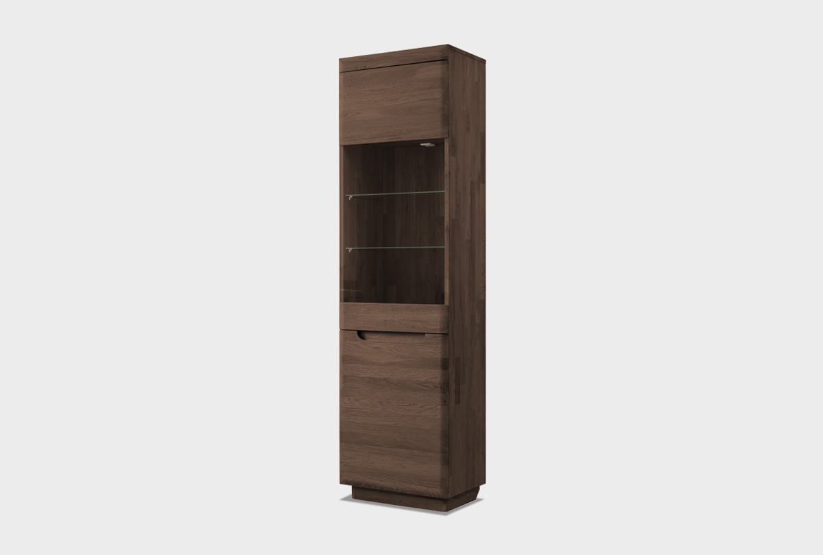 Благодаря узкой форме и спокойной геометрии витрина легко вписывается в интерьеры с природной или современной направленностью. Особенно красиво она смотрится рядом с парой в зеркальном исполнении — правой витриной «Бремен».