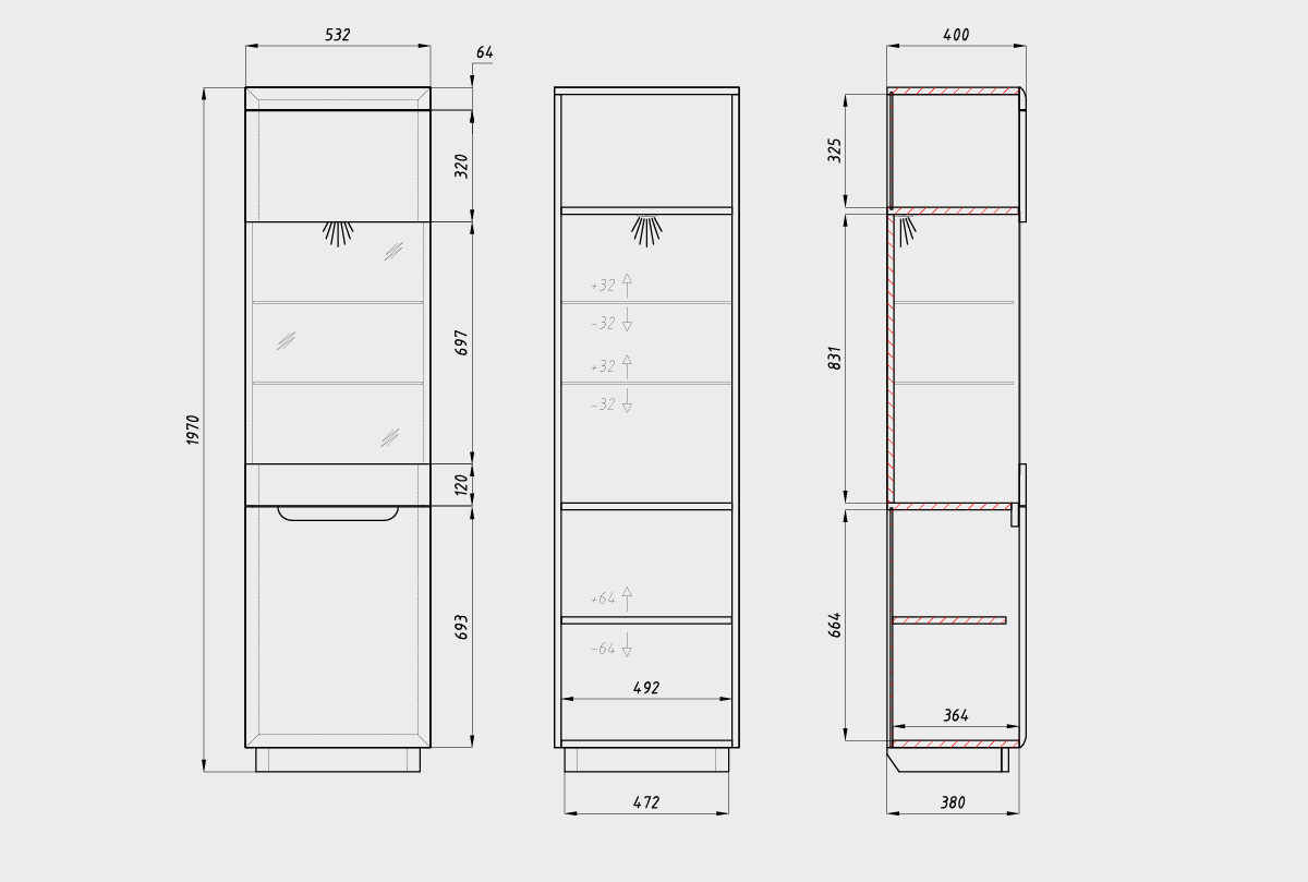 ✅ Размеры: ширина 532 мм, высота 1970 мм, глубина 400 мм — идеальный формат для зонирования и акцентов.