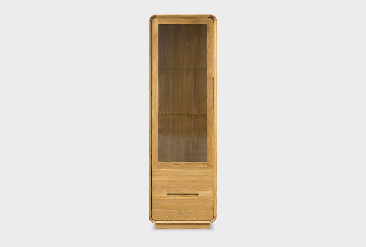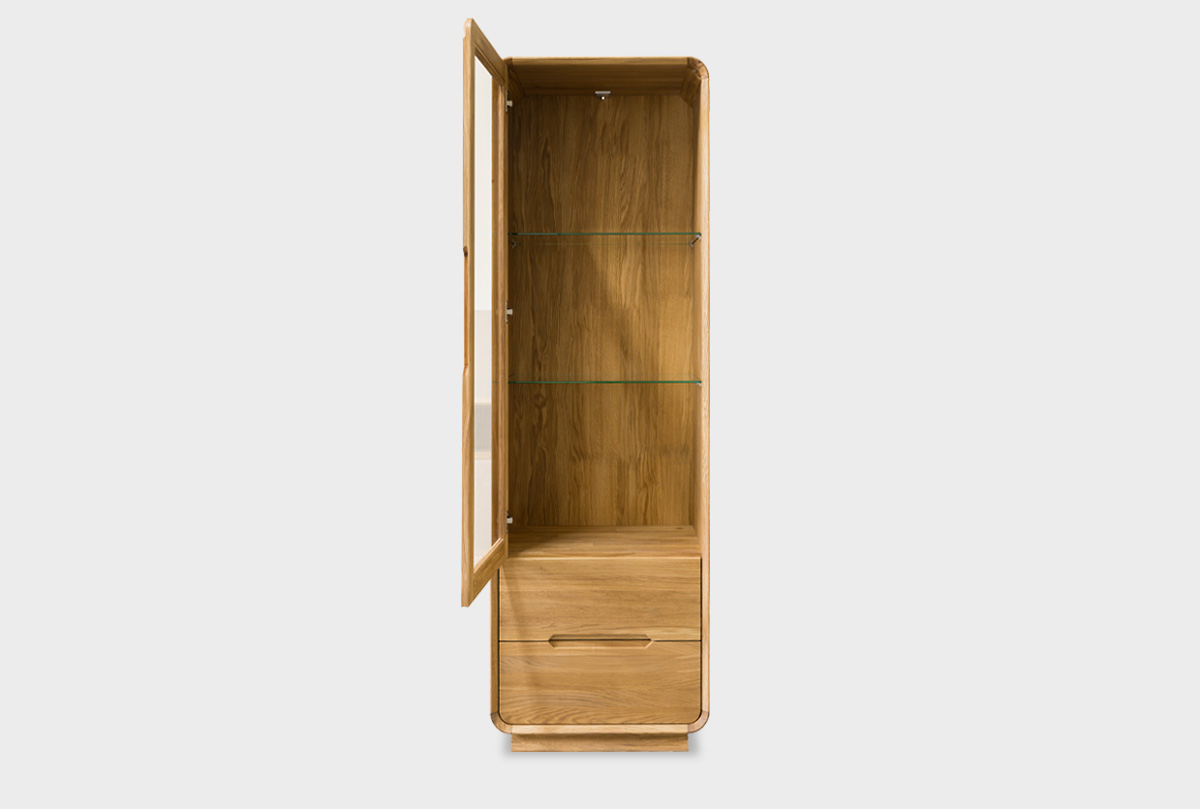 Витрина «Монблан» с левой распашной дверцей в цвете «бейц-масло» — утончённое и практичное решение для хранения и демонстрации любимых предметов. За стеклянной дверцей расположены две регулируемые по высоте стеклянные полки — чтобы красиво расставить книги, декор или посуду. В нижней части — два вместительных выдвижных ящика глубиной 385 мм, идеально подходящих для текстиля, бумаг и других вещей, которые хочется держать под рукой, но вне поля зрения.