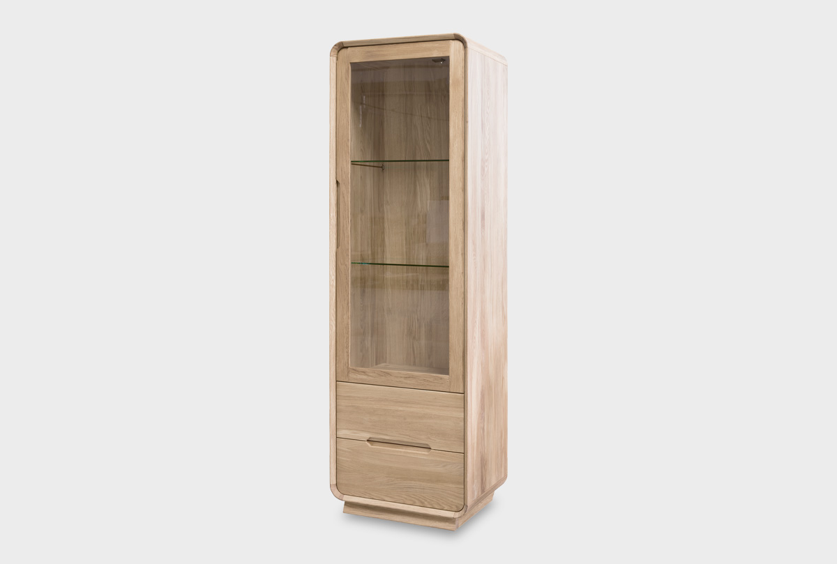 Витрина «Монблан» с правой распашной дверкой в цвете «белёный дуб» — это изящный акцент в любом пространстве. Прозрачная стеклянная дверь позволяет деликатно продемонстрировать любимую посуду, декор или книги. Две стеклянные полки внутри регулируются по высоте, адаптируясь под ваши потребности и сохраняя ощущение лёгкости благодаря прозрачности. В нижней части витрины — два вместительных выдвижных ящика глубиной 385 мм для хранения вещей, которые хочется держать под рукой, но скрыть от глаз.