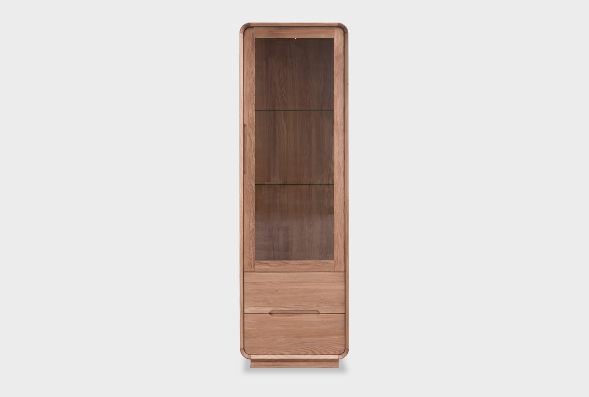 Витрина «Монблан» с правой распашной дверцей — это изящный акцент в любом пространстве. Прозрачная стеклянная дверь позволяет деликатно продемонстрировать любимую посуду, декор или книги. Две стеклянные полки внутри регулируются по высоте, адаптируясь под ваши потребности и сохраняя ощущение лёгкости благодаря прозрачности. В нижней части витрины — два вместительных выдвижных ящика глубиной 385 мм для хранения вещей, которые хочется держать под рукой, но скрыть от глаз.